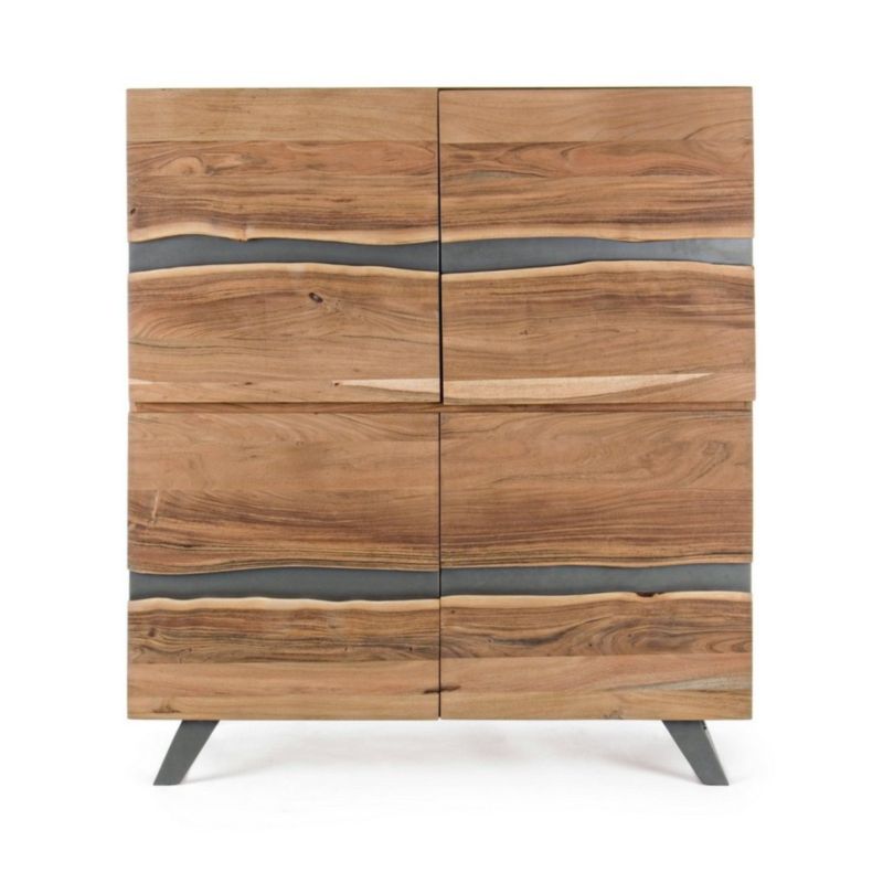 ESTRUCTURA DE MADERA DE ACACIA, PATAS DE METAL. PUERTAS CON INSERCIONES DE METAL. ACABADO A BASE DE POLIURETANO. COMPARTIMENTO CON BALDA. PIES PARA MONTAR.
