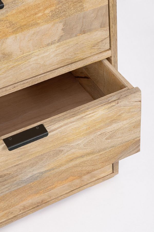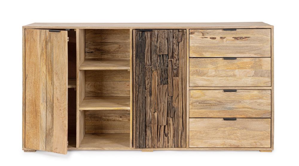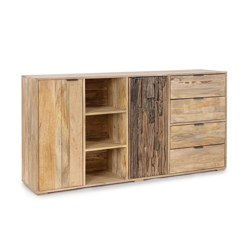 ESTRUCTURA DE MADERA DE MANGO, RESPALDO DE MADERA CONTRACHAPADA. FRENTE DE LAS PUERTAS DE MADERA DE MANGO O RECICLADO. ACABADO ACRILICO PROTECTOR. TIRADORES DE METAL. EL PRODUCTO DE MADERA RECICLADA SE CARACTERIZA POR LA PRESENCIA DE TACOS DE MADERA DE DIFERENTES FORMAS Y COLORES. LAS GRIETAS, FISURAS O IMPERFECCIONES, QUE TAMBIÉN PUEDEN GENERARSE CON E TIEMPO, SON CARACTERÍSTICAS DE ESTE MATERIAL Y HACEN QUE CADA PIEZA SEA ÚNICA Y ORIGINAL.