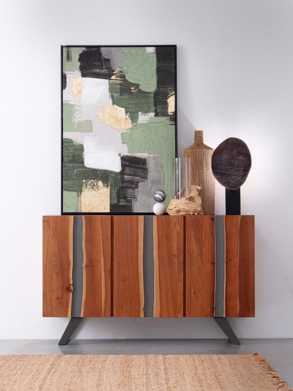 ESTRUCTURA DE MADERA DE ACACIA, PATAS DE METAL. PUERTAS CON INSERCIONES DE METAL. ACABADO A BASE DE POLIURETANO. COMPARTIMENTO CON BALDA. PIES PARA MONTAR.