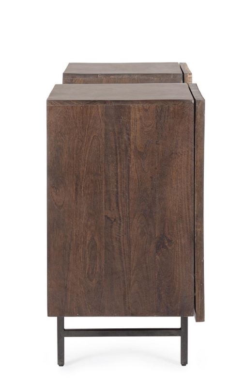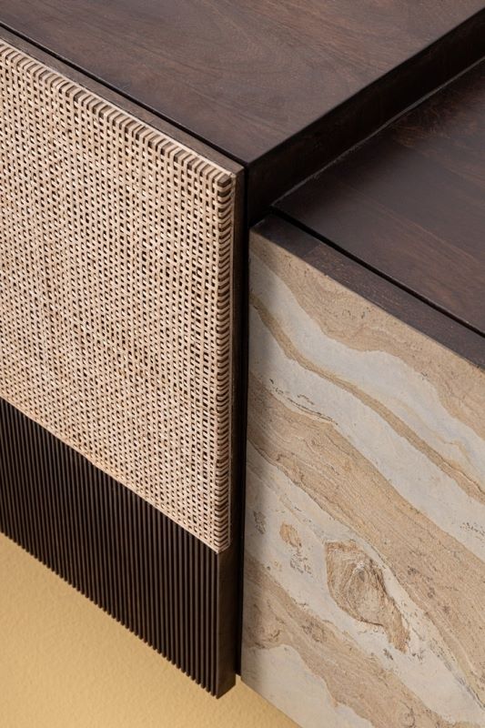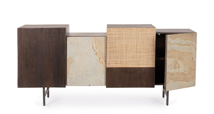 ESTRUCTURA DE MADERA DE MANGO, RESPALDO DE DM. FRENTE DE LOS CAJONES: DOS CHAPADOS PIEDRA NATURAL, UNO DE MADERA Y UNO CON APLICACIONES DE RATAN. ACABADO CON BARNIZ A BASE DE AGUA. PATAS DE ACERO BARNIZADO A POLVO EPOXI. PATAS PARA MONTAR.