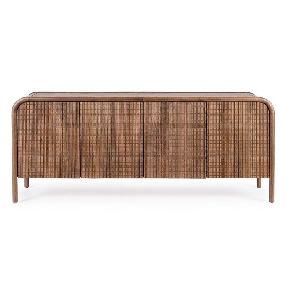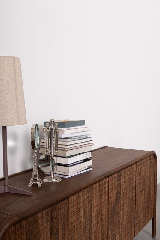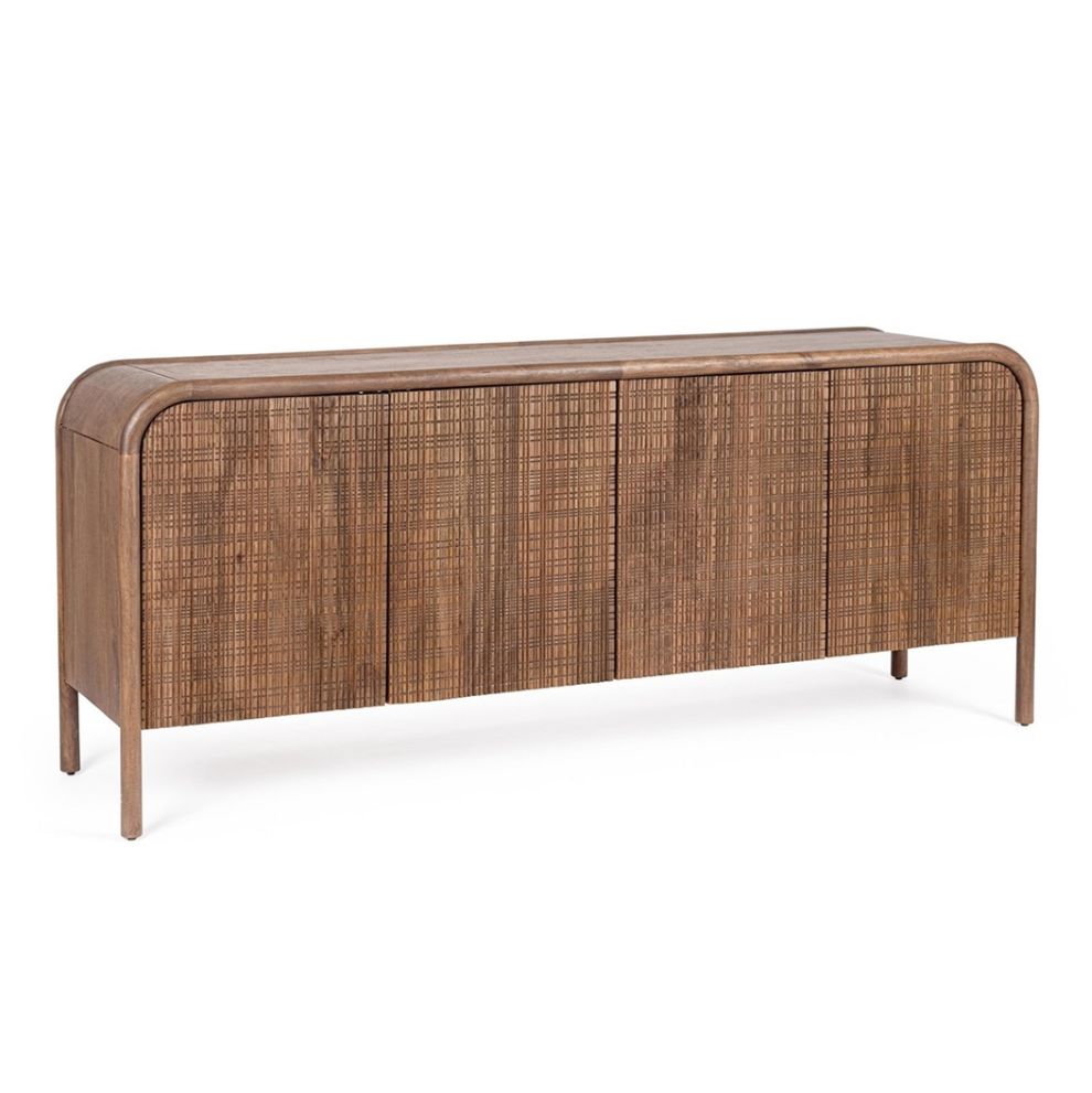 ESTRUCTURA DE MADERA DE MANGO, RESPALDO DE DM. FRENTE DE LAS PUERTAS CON DECORACIONES TARACEADAS Y HECHAS A MANO. ACABADO CON BARNIZ A BASE DE AGUA. COMPARTIMIENTO PUERTA CON ESTANTE.