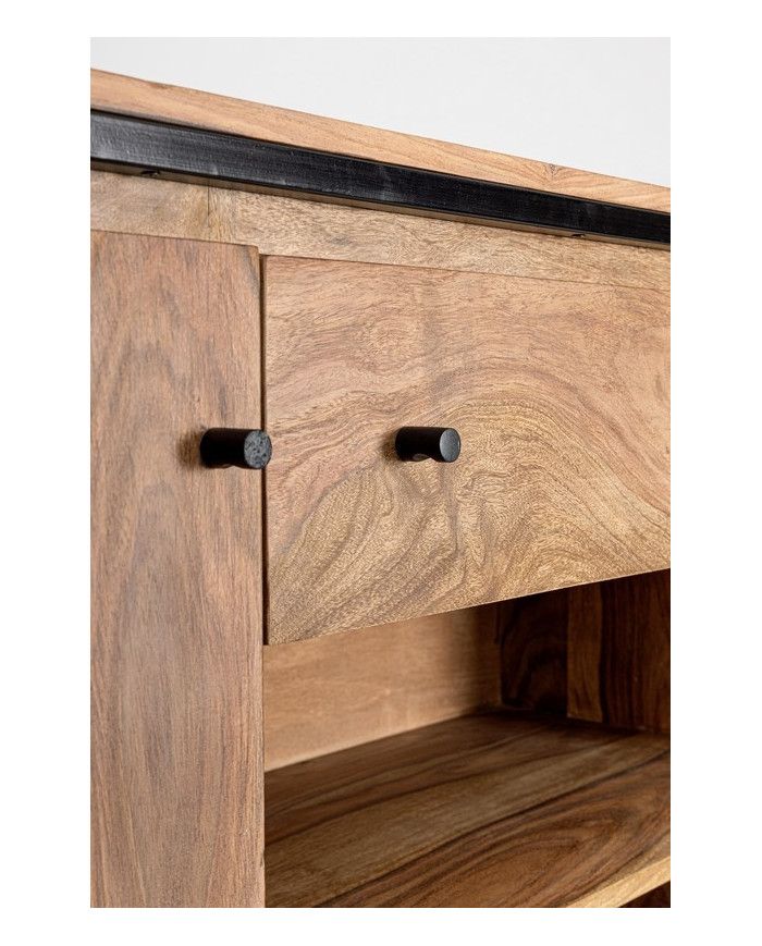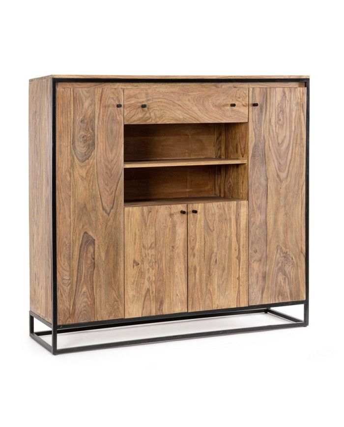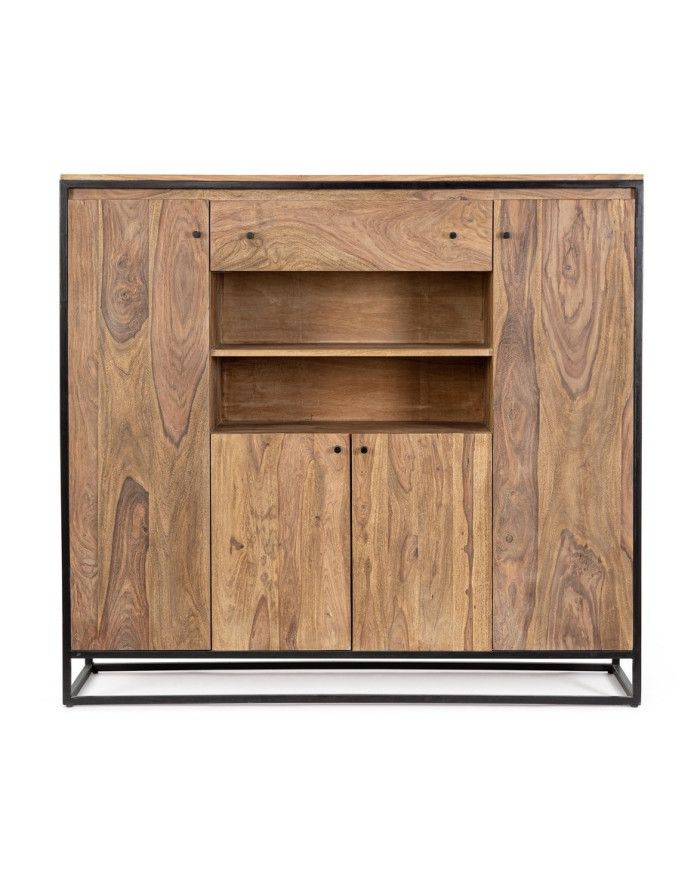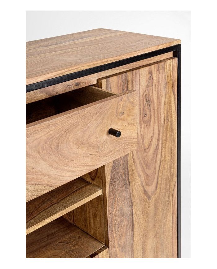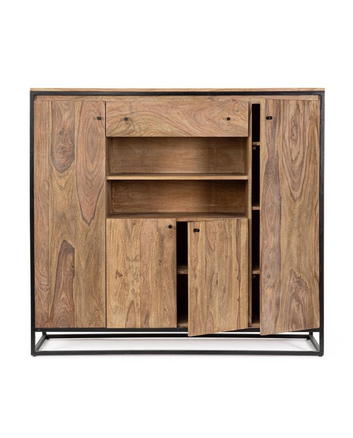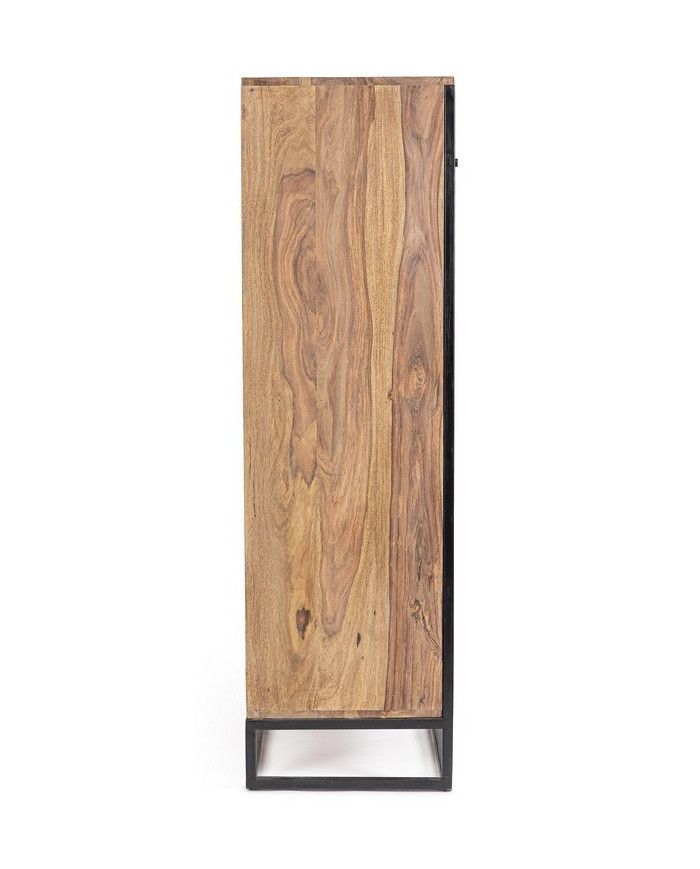 ESTRUCTURA DE MADERA SHEESHAM Y ACERO BARNIZADO A POLVO EPOXY, RESPALDO DE CONTRACHAPADO. ACABADO PROTECTOR ACRÍLICO. MANILLAS DE ACERO. VANO DE LA PUERTA EQUIPADO CON BALDA.