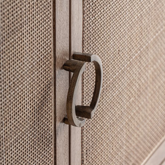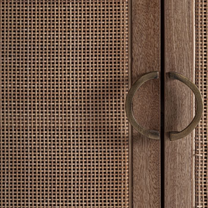 Aparador Beckley de estilo nórdico, fabricado en madera de mango en color marrón, combinado con ratán en color marrón claro y madera dm. Producto desmontable.