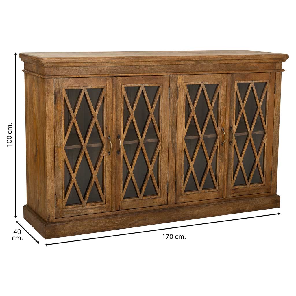 Este aparador ofrece una amplia superficie de almacenamiento y exhibición en un diseño elegante que combina madera y cristal.Con dimensiones de 170x40x100 cm, es ideal para colocar en el comedor o la sala de estar.