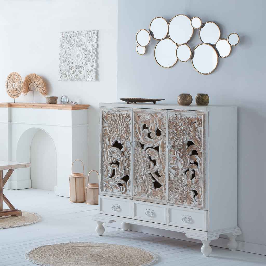 Este aparador en blanco, con dimensiones de 115x43x110h cm, es una pieza funcional y elegante para tu hogar. Su diseño espacioso y sus detalles de madera enriquecen tu espacio de almacenamiento y exhibición. Además, su versatilidad permite que lo utilices en diferentes habitaciones, aportando estilo y orden.
