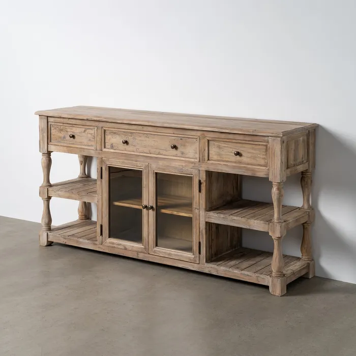 Material: madera de pino reciclada, cristal. Cajones: 41x15cm / 72x15cm. Puertas: 36x54cm. Altura huecos laterales: 24cm.