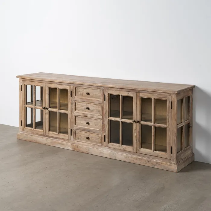 Material: madera de pino reciclada, cristal. Cajones: 39,5×13,5cm. Puertas: 39×63,5cm.
