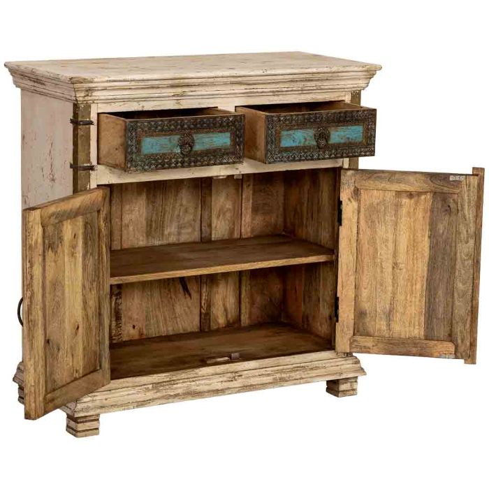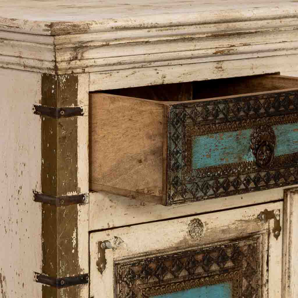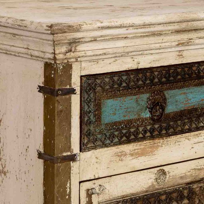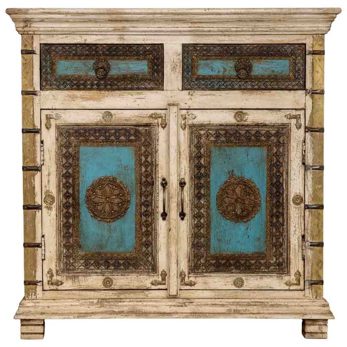 Añade a tu hogar una pieza de auténtico artesanado indio con este compacto aparador artesanal en blanco envejecido. Con 90 cm de ancho, 40 cm de fondo y 90 cm de alto, concentra en su fachada toda la riqueza decorativa de la colección india. Las dos puertas con apliques repujados, paneles turquesa y medallones de latón dorado crean una frontal de gran suntuosidad.Los dos cajones superiores con los mismos elementos decorativos y tiradores de argolla en latón completan un conjunto artesanal de primer nivel. El acabado blanco distressed con marcas de desgaste aporta carácter vintage de primera calidad y autenticidad.Perfecto para entradas, dormitorios, despachos o cualquier espacio más íntimo que necesite una pieza de carácter y artesanado étnico de altísima calidad sin ocupar demasiado espacio en la estancia.