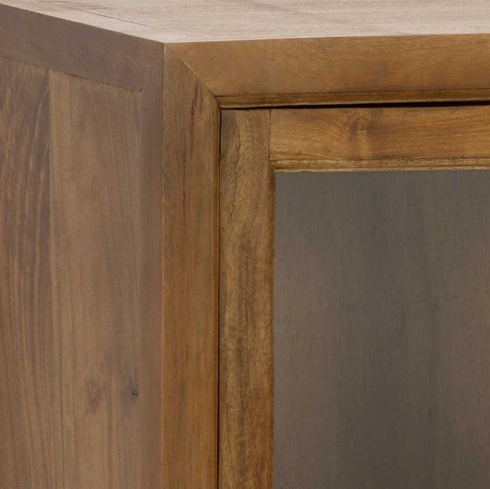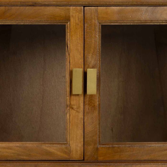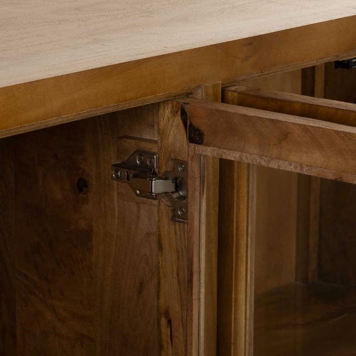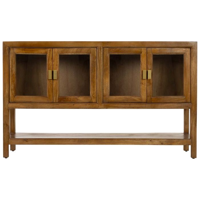 Aparador de madera con acabado artesanal en tono marrón, equipado con 4 puertas que ofrecen un generoso espacio de almacenamiento, ideal para mantener el orden en la entrada del hogar. Su diseño elegante y funcional combina a la perfección calidez y estilo, aportando carácter a cualquier ambiente.