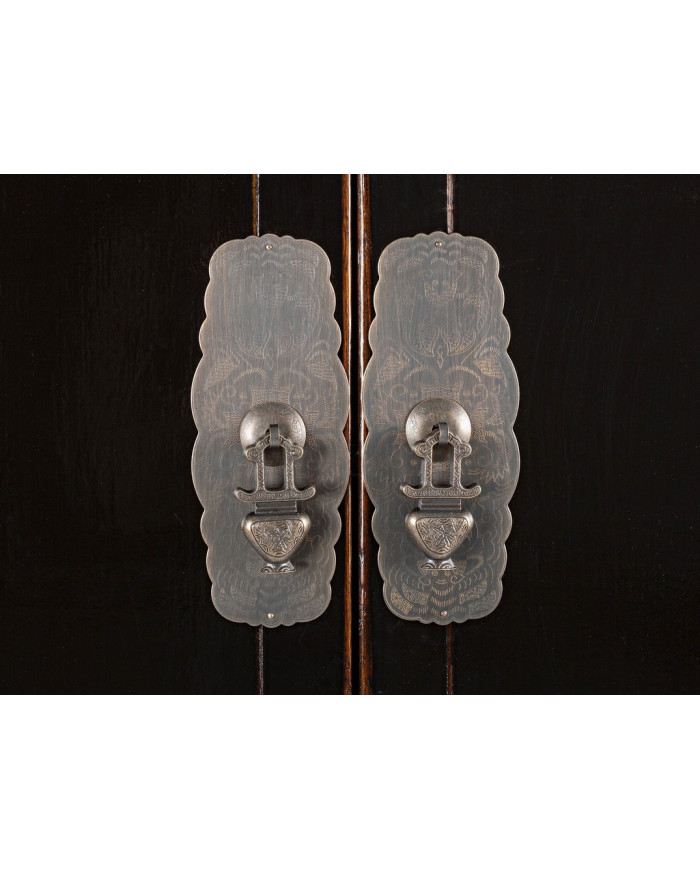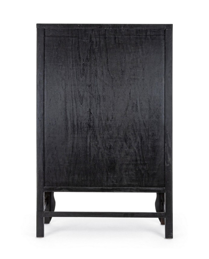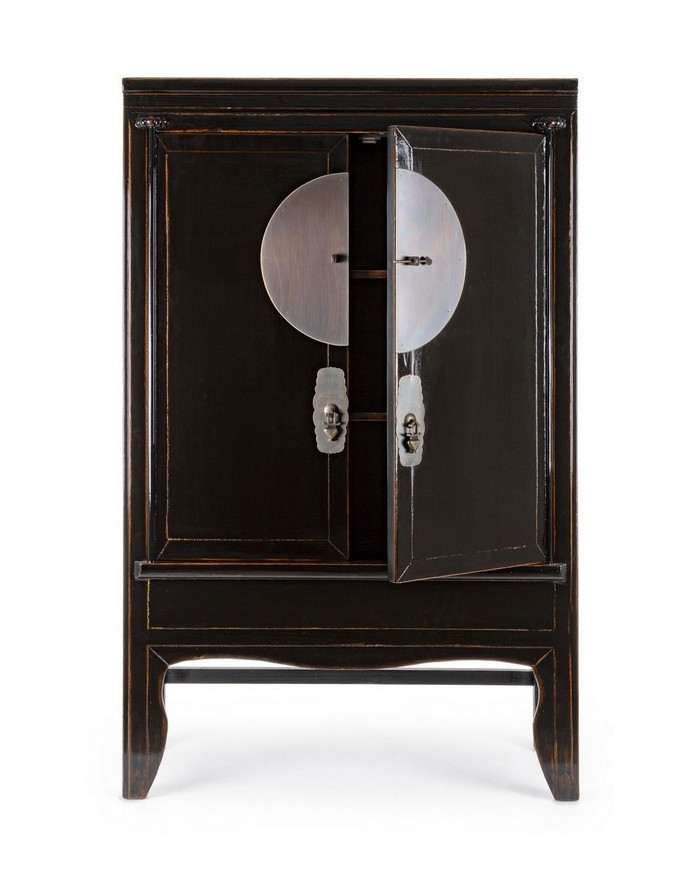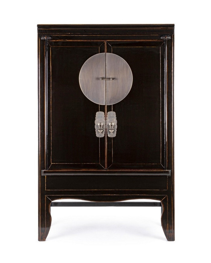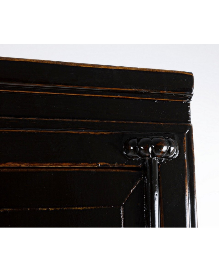 ESTRUCTURA DE MADERA DE OLMO RECICLADO. RESPALDO Y PANELES INTERIORES DE CONTRACHAPADO. ACABADO BRILLO PATINADO A BASE DE AGUA. TIRADORES DE COBRE.