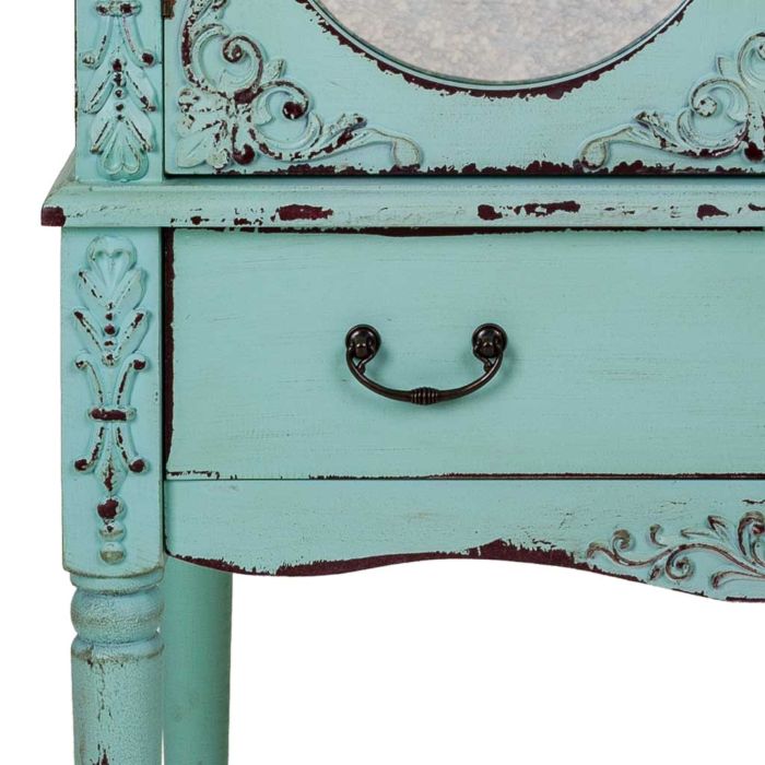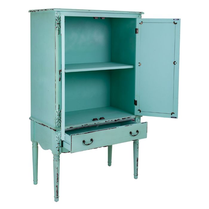 Armario de madera de abeto y Dm de 80x42x140 cm Te sugerimos un armario fabricado en madera DM y abeto, de color azul turquesa, que cuenta con 2 puertas 1 cajon. Las patas finas y redondas, le aportan un aire mas robusto, estable, haciendo con que puedas colocarlo en tu salon, comedor o dormitorio. Por la parte interior, cuenta con 1 balda que divide el espacio en 2 partes, donde puedes guardar vajillas, libros, articulos personales, etc. Un armario de estilo exotico que, ademas, por su forma, color y disenyo, puede ser colocado en ambientes decorados con estetica contemporanea, rustica o clasica. Sus dimensiones y caracteristicas son: Largo: 80 cm. Alto: 140 cm. Ancho: 42 cm. Material: Madera DM, madera de abeto. Dispone de 2 puertas,1 cajon y 1 balda.
