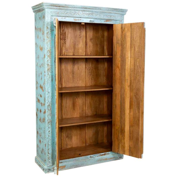 Armario artesanal fabricado en madera maciza con un elegante acabado azul envejecido que aporta carácter y distinción. Con 116 cm de ancho, 45 cm de fondo y 203 cm de alto, ofrece un generoso espacio interior para organizar ropa o enseres, combinando funcionalidad con un estilo rústico y sofisticado.