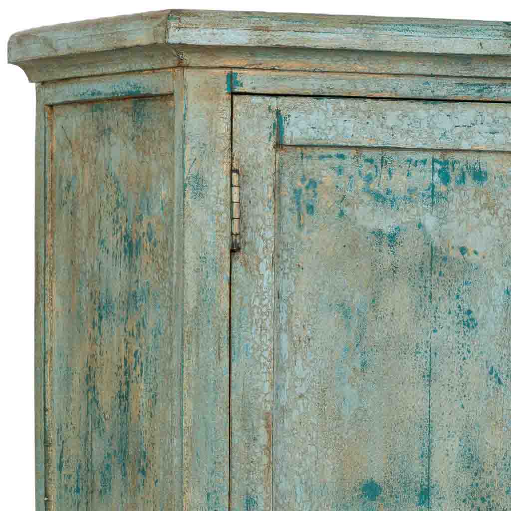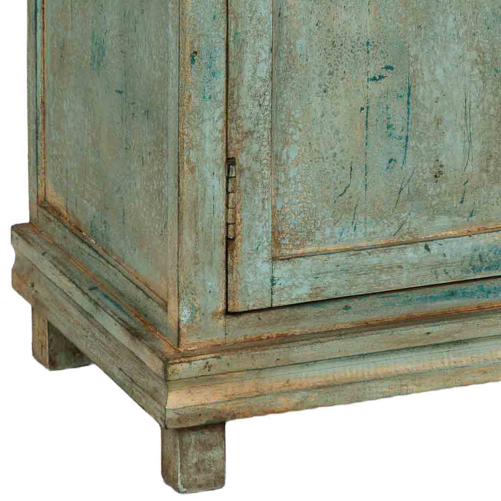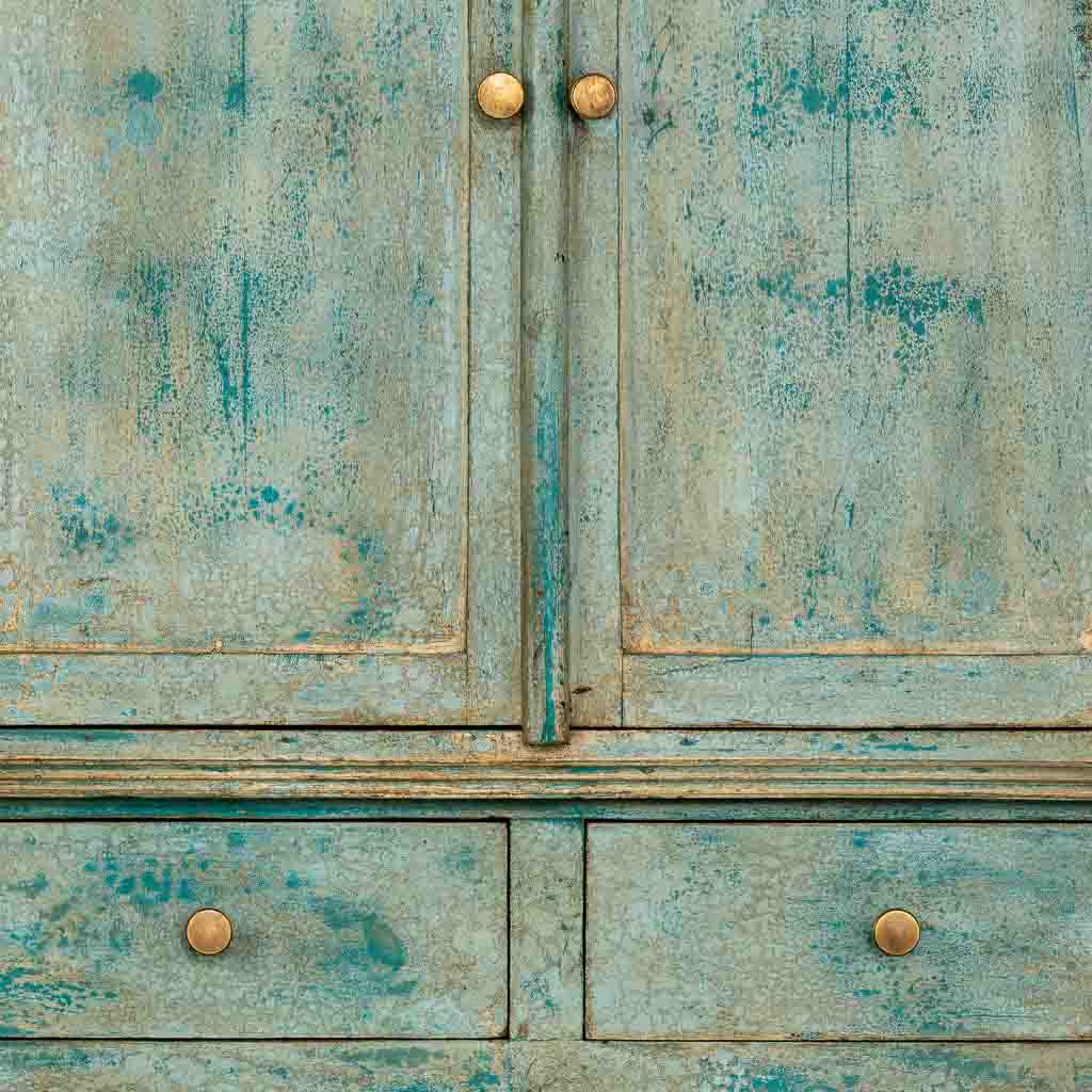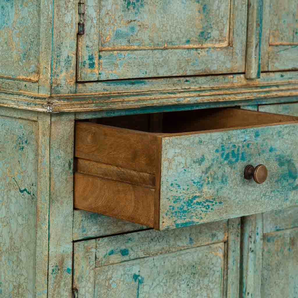 Armario vertical alto (180 cm) y estrecho (85 cm de ancho), fabricado en madera con un distintivo acabado en color turquesa. Su característica artesanal le confiere un diseño único y tradicional. Es una pieza de almacenamiento funcional para dormitorios, salones o recibidores, que se convierte en un acento decorativo llamativo gracias a su color vibrante y su toque vintage o rústico.