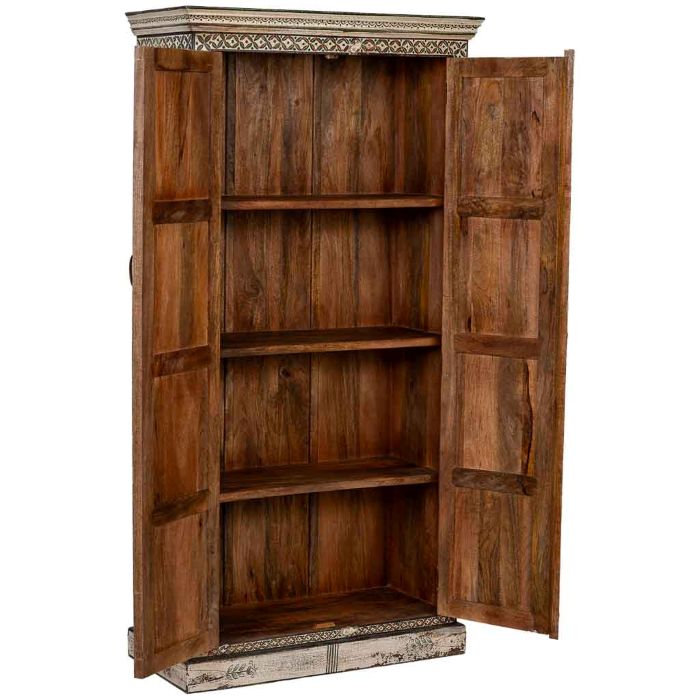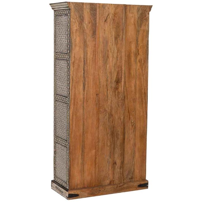 Armario de madera de mango en tonos grisáceos y multicolor, de gran altura, completamente decorado con pinturas artesanales de extraordinaria elaboración, en color negro. Los motivos geométricos y florales pintados incluyen patrones de estrellitas, rombos y cenefas entrelazadas en los laterales, y paneles de medallones florales con motivos circulares y textos decorativos en las puertas batientes.La paleta de colores neutros, grises y marrones con toques de terracota y verde recuerda al arte decorativo de Oriente Próximo y Norte de África. Madera de mango sólida y resistente.Sus dimensiones de 92x34x183 cm de alto lo convierten en una pieza imponente y protagonista para salones, dormitorios o estudios. Un armario que es mucho más que un mueble: es una obra de arte artesanal que transforma cualquier estancia en un espacio único de gran belleza cultural.
