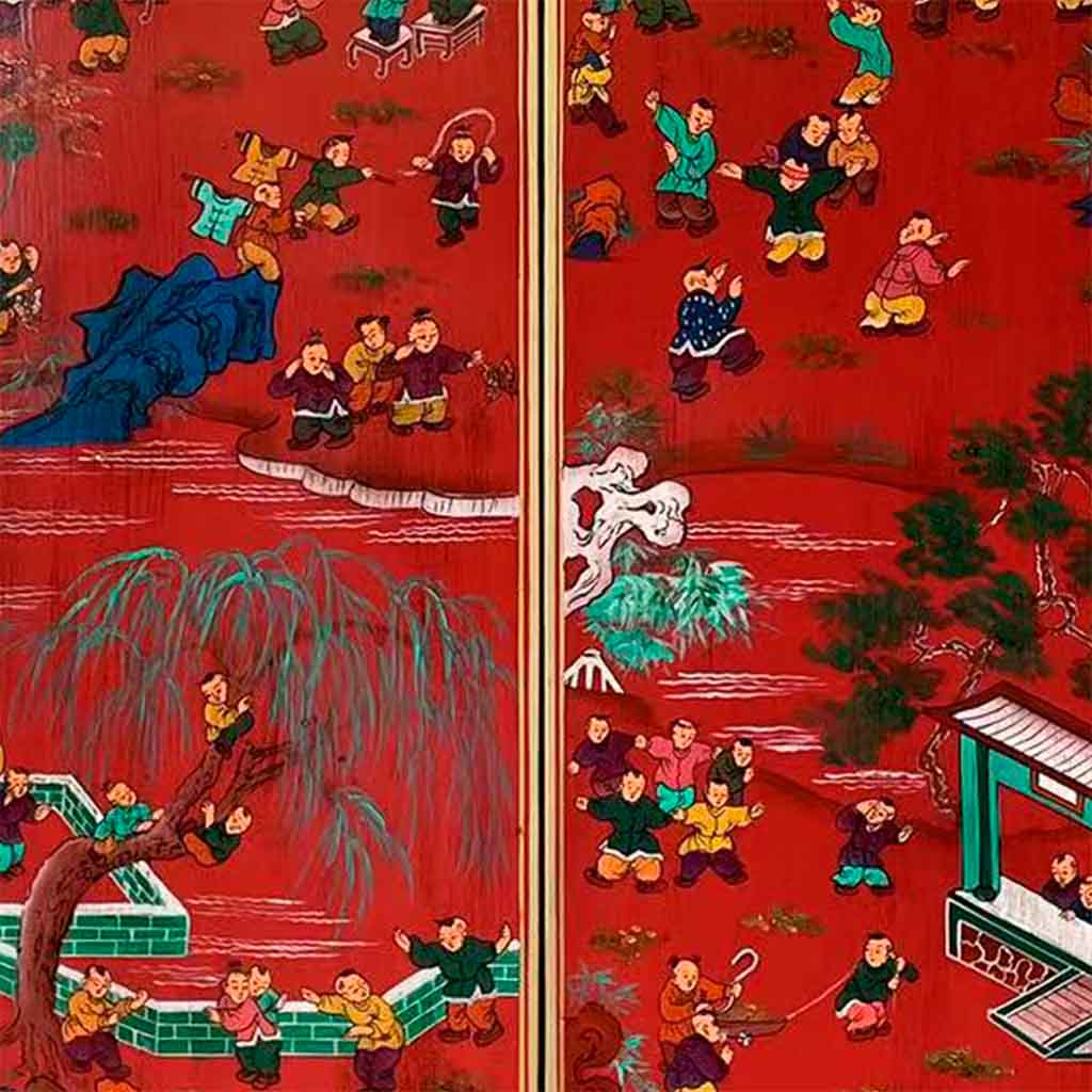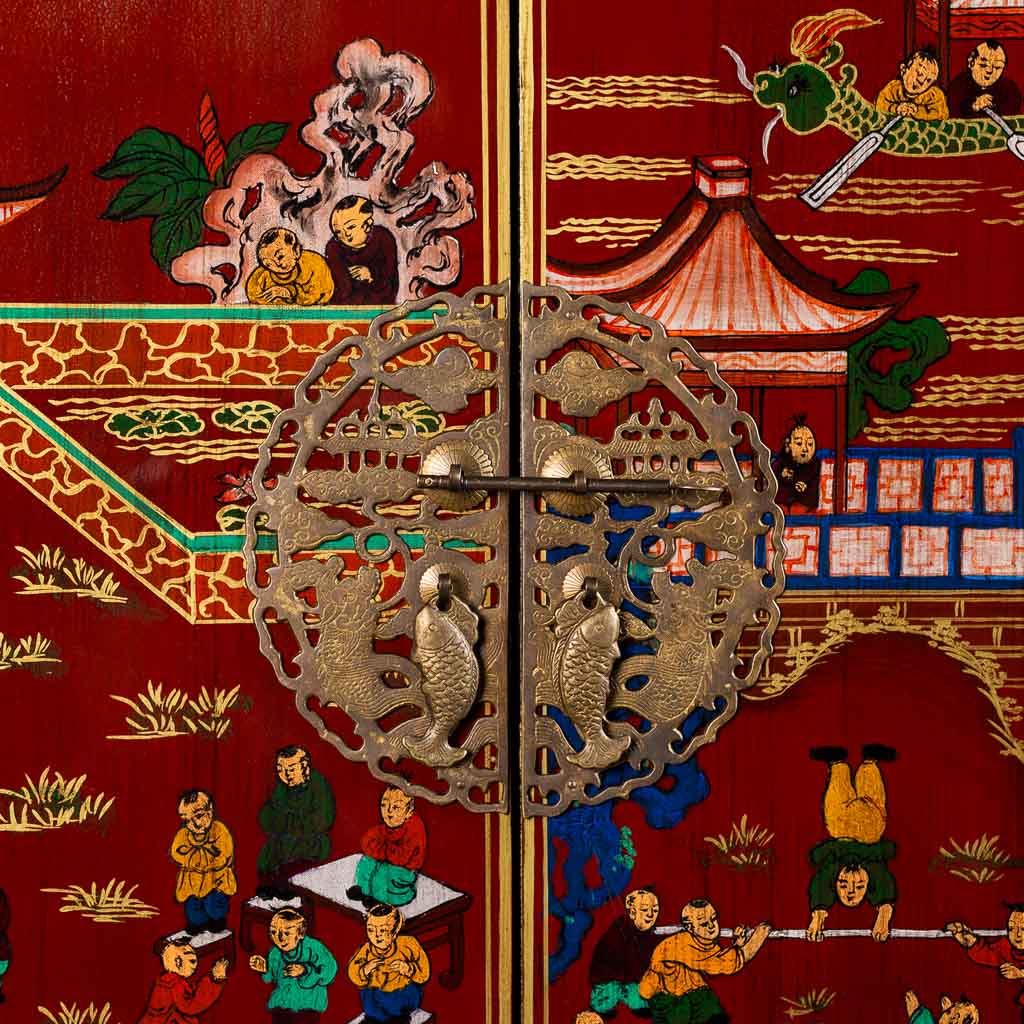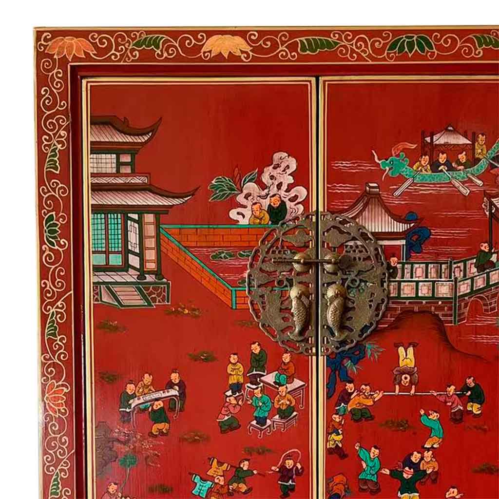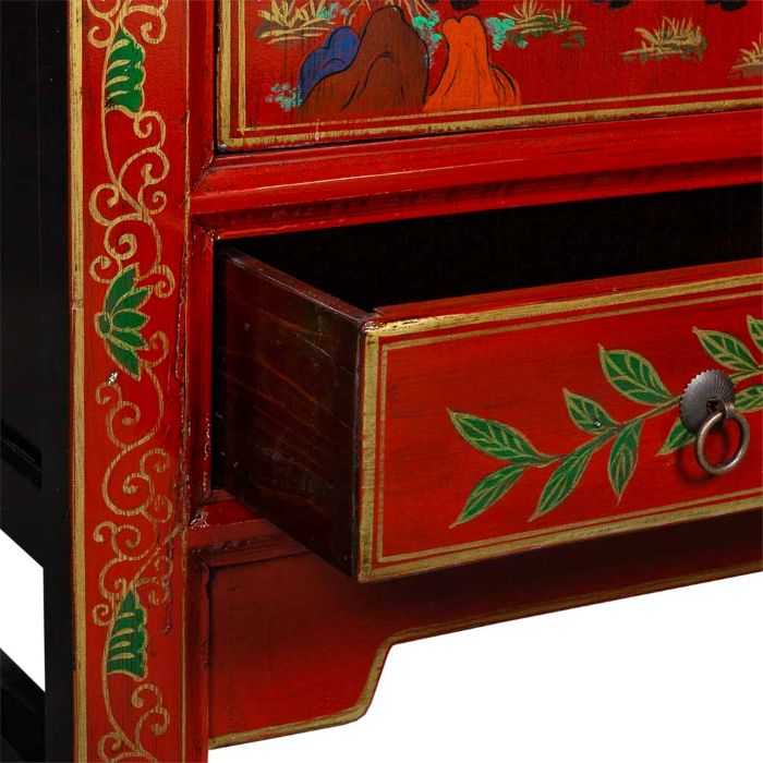 Este encantador armario de madera presenta un acabado artesanal en un llamativo color rojo. Con dos puertas, sus dimensiones son de 80 centímetros de largo, 38.5 centímetros de ancho y 174.5 centímetros de altura. Sus detalles pintados a mano agregan un toque de arte y personalidad a esta pieza de mobiliario.