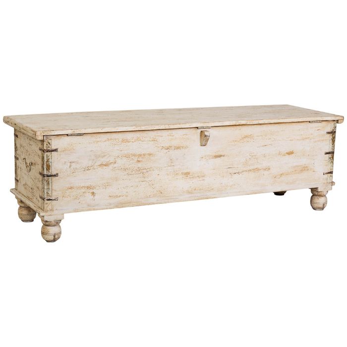 Baúl o arcón de madera de grandes dimensiones (150 cm de largo), con una altura baja de 45 cm. Su acabado en tono beige y su naturaleza artesanal le otorgan un aspecto cálido y orgánico. Es una pieza multifuncional que sirve como amplio espacio de almacenamiento y como mesa auxiliar o banco, aportando un toque rústico, natural o shabby chic al ambiente.