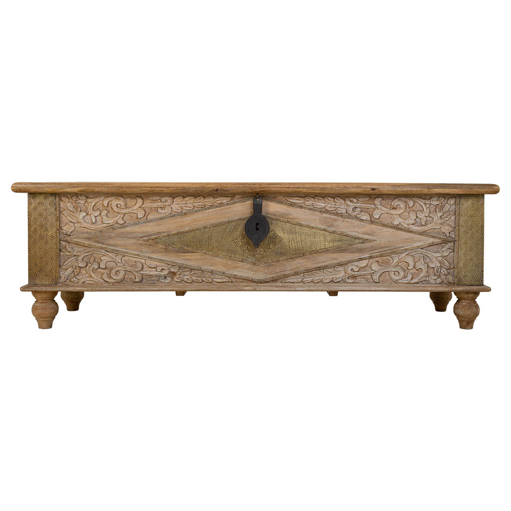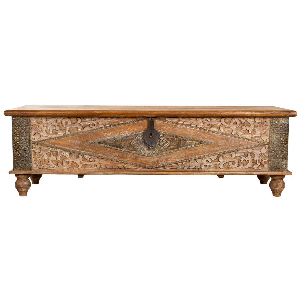 Baúl de madera tallada (150 cm de largo, 46 cm de altura). Funciona perfectamente como mesa de centro o arcón a los pies de la cama, ofreciendo una gran superficie plana. El acabado artesanal y los detalles de talla en la madera lo convierten en un mueble excepcionalmente decorativo, lleno de historia y personalidad, además de proporcionar amplio espacio de almacenamiento interior.