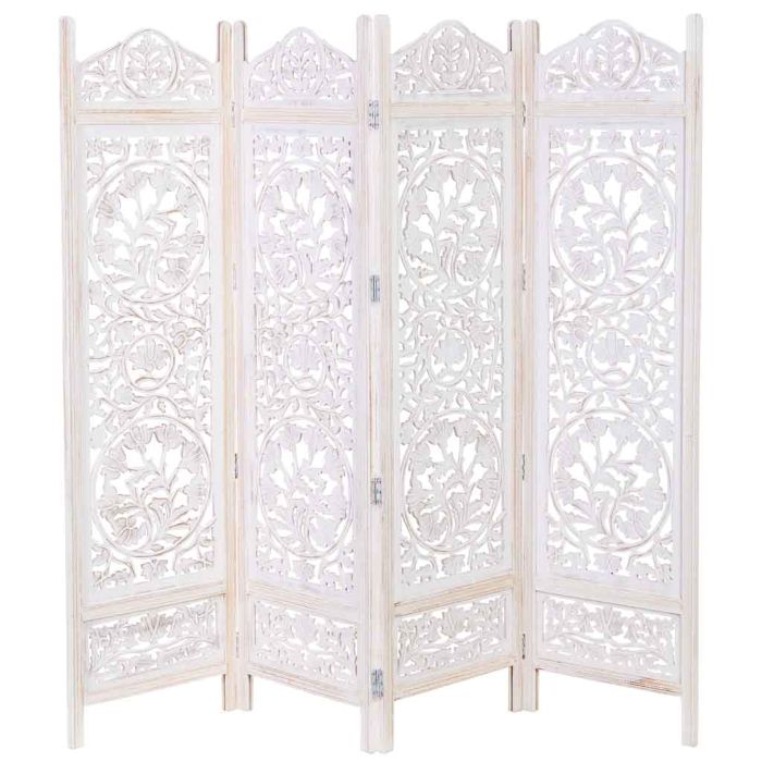 Imponente biombo de madera de 4 paneles (50x3x183h cm c/u). Auténtica obra de arte artesanal. Destaca por detallados tallados a mano que lo transforman en una pieza decorativa central. Su gran altura (183 cm) y grosor (3 cm) le confieren presencia majestuosa y estabilidad. Ideal para crear ambientes exóticos, bohemios, coloniales o clásicos, añadiendo valor artístico, textura y elegancia.