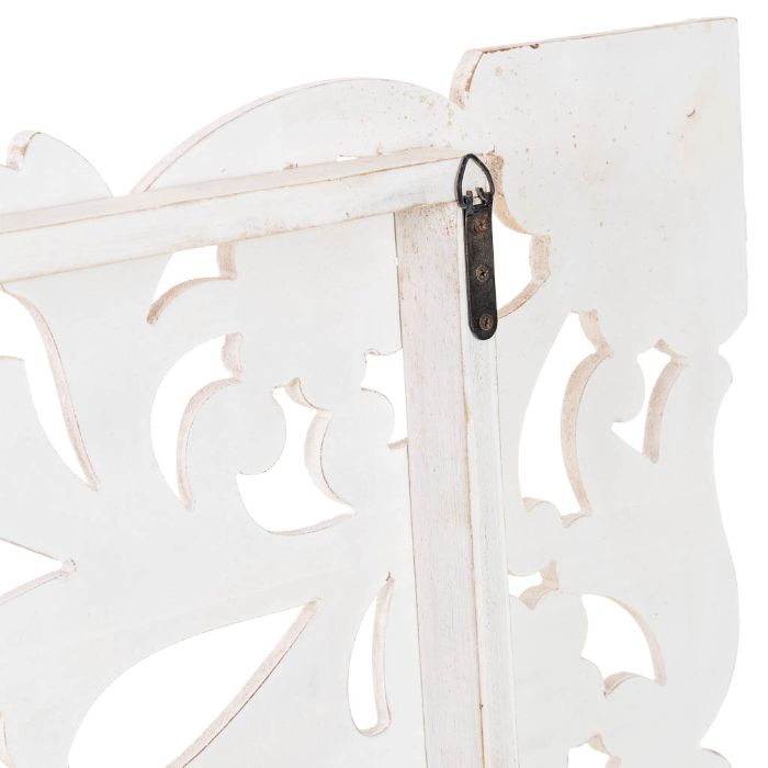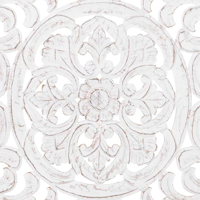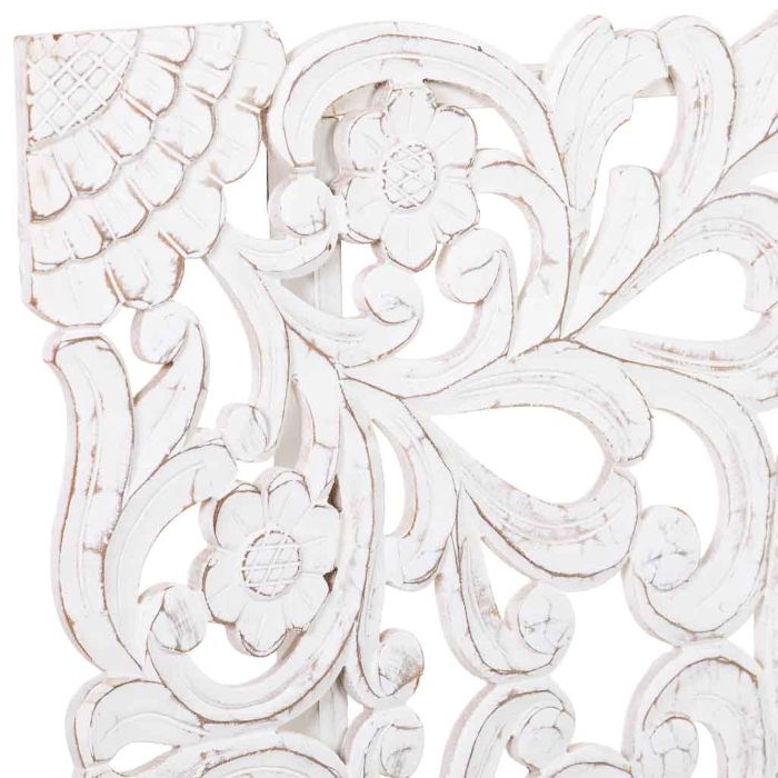 Magnífico panel de madera tallada (180x90x2,5h cm). Pieza decorativa de gran impacto visual. Elaborado con minucioso tallado a mano, presenta diseños y texturas con profundidad artística única. Su acabado blanco le otorga luminosidad y versatilidad excepcional. Ideal para pared principal, como cabecero de cama o para complementar una consola. Transforma el espacio añadiendo elegancia, textura y un punto focal etéreo.