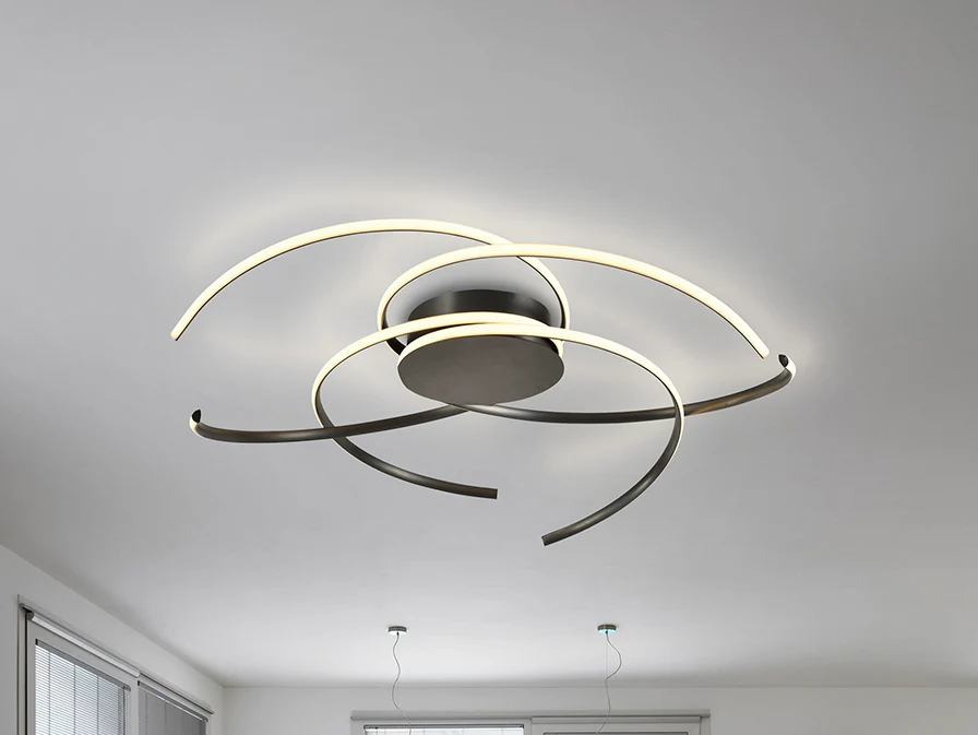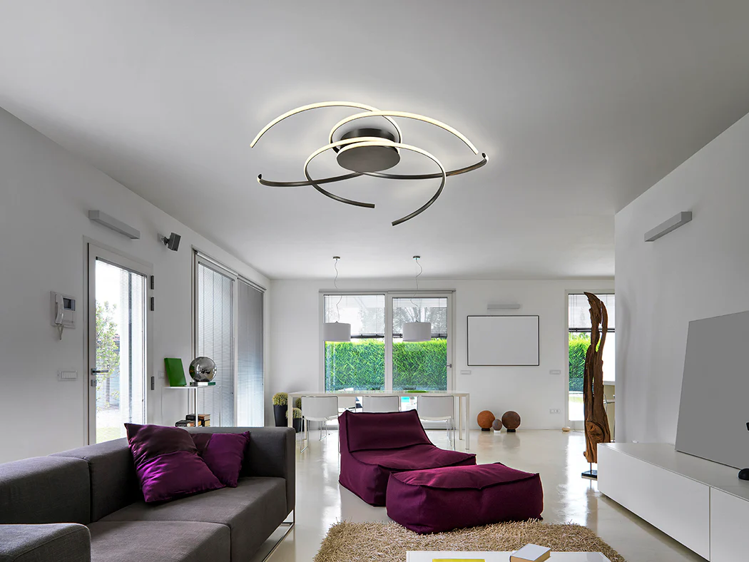 Plafón de techo fabricado en aluminio y acero con un elegante acabado en negro mate. Incorpora difusor de silicona opal que ofrece una iluminación suave, uniforme y sin deslumbramientos. Equipado con tecnología LED de 68W, permite regular la temperatura de color (CCT 2700K–5000K) y la intensidad lumínica gracias a su función DIMABLE. Proporciona un flujo luminoso de 4.800 lm e incluye mando a distancia para un control cómodo y preciso de la luz.