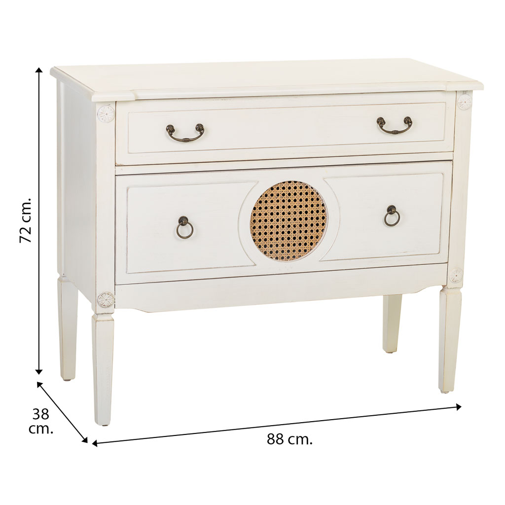 Comoda de madera de abeto y rattan en blanco envejecido de 88x38x72 cm La comoda con rattan esta fabricada con madera de abeto, lacada en color blanco envejecido. Una comoda versatil que encaja en ambientes de diferentes estilos decorativos, ideal para tu dormitorio, salon y recibidor. Dispone de dos cajones de almacenaje, para tus prendas de vestir mas delicadas u objetos de uso cotidiano. Sus medidas y caracteristicas son: Largo: 88 cm. Alto: 72 cm. Ancho: 38 cm. Material: madera de abeto, rattan y mdf No requiere montaje.