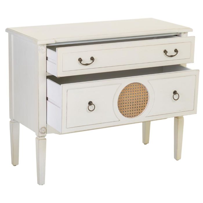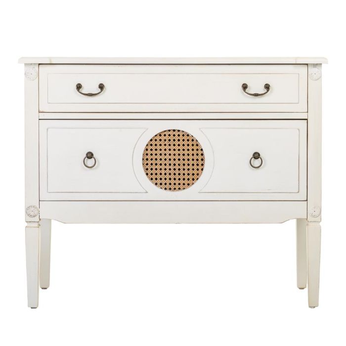 Comoda de madera de abeto y rattan en blanco envejecido de 88x38x72 cm La comoda con rattan esta fabricada con madera de abeto, lacada en color blanco envejecido. Una comoda versatil que encaja en ambientes de diferentes estilos decorativos, ideal para tu dormitorio, salon y recibidor. Dispone de dos cajones de almacenaje, para tus prendas de vestir mas delicadas u objetos de uso cotidiano. Sus medidas y caracteristicas son: Largo: 88 cm. Alto: 72 cm. Ancho: 38 cm. Material: madera de abeto, rattan y mdf No requiere montaje.