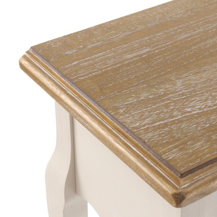 Con una estructura de madera MDF y paulownia, presenta un acabado en blanco y una superficie en tono madera natural.