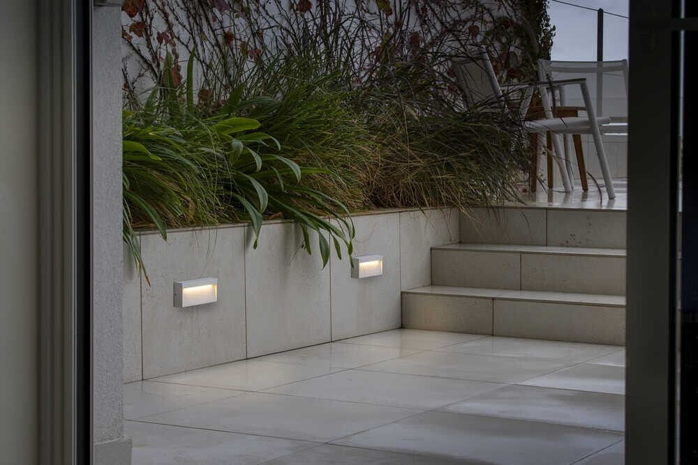 DUNE es un aplique rectangular de exterior blanco mate, ideal para iluminación funcional de señalización en espacios exteriores. Incorpora switch integrado que permite seleccionar entre 4 temperaturas de color: 2200K, 2700K, 3000K o 4000K.