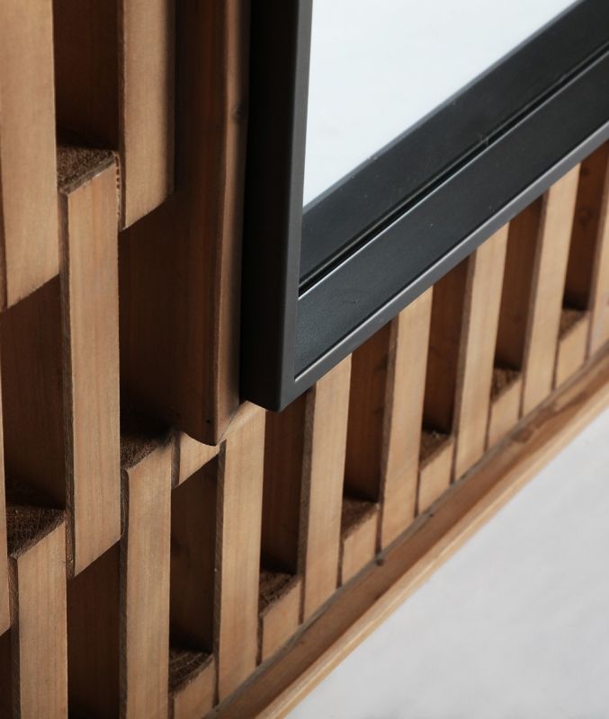 Este espejo BUSK, combina modernidad y artesanía con su marco de madera calado, creando un efecto visual único que aporta carácter y sofisticación a cualquier espacio. Su diseño geométrico y elegante lo convierte en una pieza decorativa versátil y atemporal.