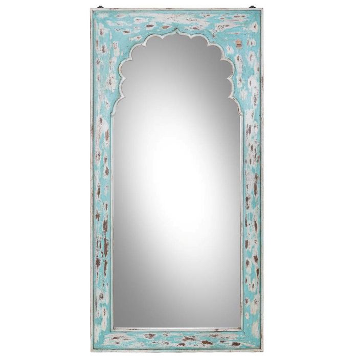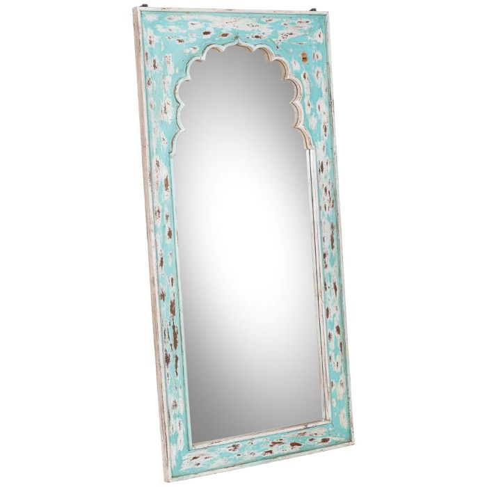 Transforma tu hogar con este impresionante espejo de madera de mango en tonos verdes envejecidos, una pieza artesanal única que combina arte y funcionalidad.Su arco lobulado tallado a mano evoca la elegante arquitectura de los palacios mogoles indios, creando un efecto visual de gran impacto decorativo. El acabado verde con desgaste natural aporta autenticidad y carácter vintage, haciendo de este espejo una pieza de colección irrepetible.Con unas medidas de 100x5x200h cm, es perfecto como espejo de cuerpo entero en dormitorios o pasillos. La madera de mango maciza, tratada artesanalmente, garantiza solidez y durabilidad a lo largo del tiempo.Su estetica boho-etnica lo hace ideal para estilos oriental, colonial o ecletico. El color verde, visible en el marco y el arco, añade frescura y vida al espacio.Cada espejo es una pieza unica, con ligeras variaciones en el acabado que son senal de su elaboracion artesanal. Una inversion decorativa que marcara la diferencia.