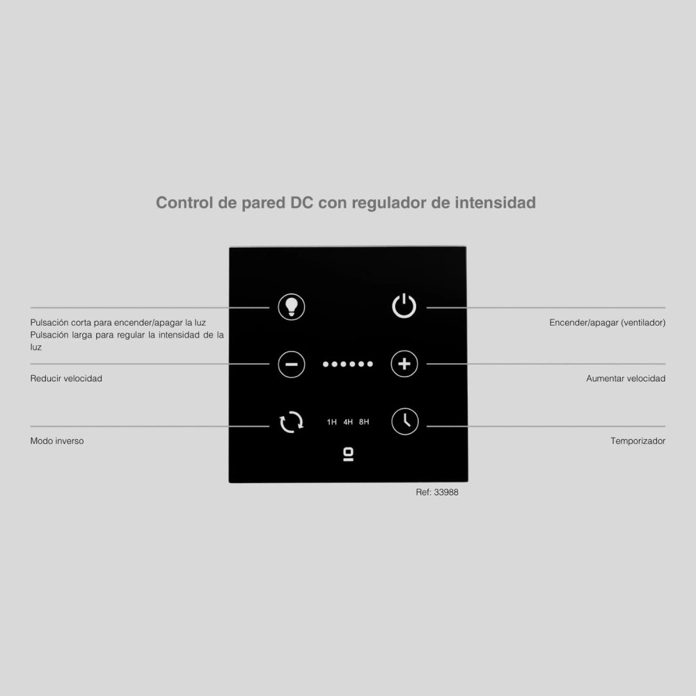 También incluye una función de regulación de luz y se conecta de forma inalámbrica al ventilador mediante radiofrecuencia. Permite la gestión de todos los ventiladores dentro de un rango máximo de 15 m, esto puede variar según las condiciones de instalación.
