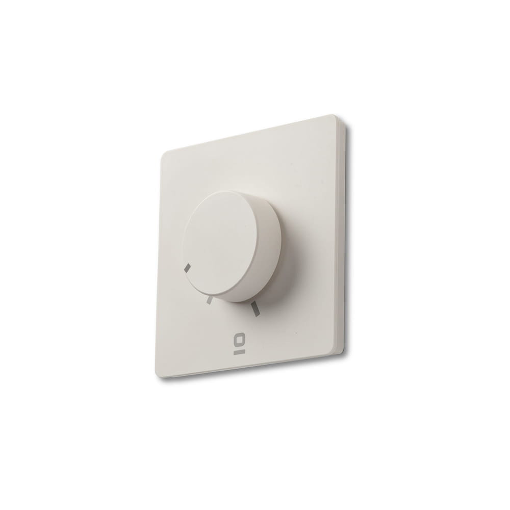 Controlador de pared rotativo blanco con control RF y 6 velocidades, compatible con ventiladores de techo. Instalación fácil y manejo intuitivo.