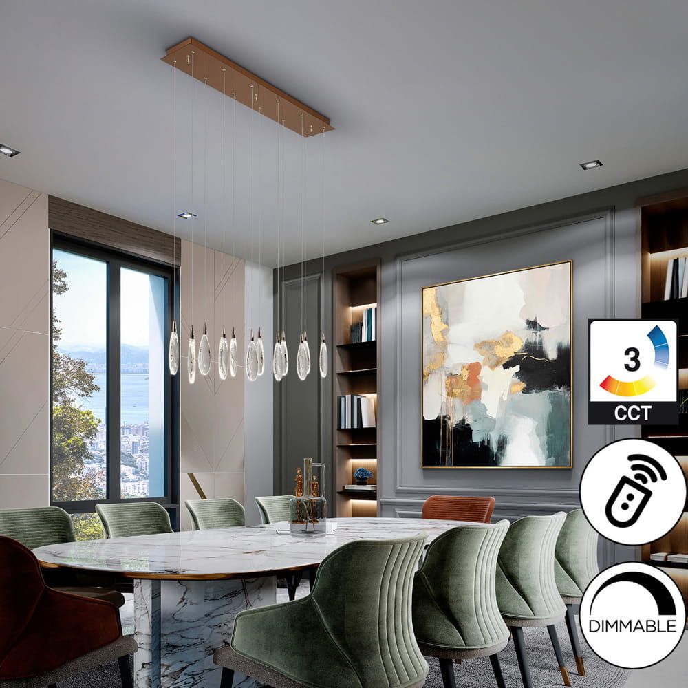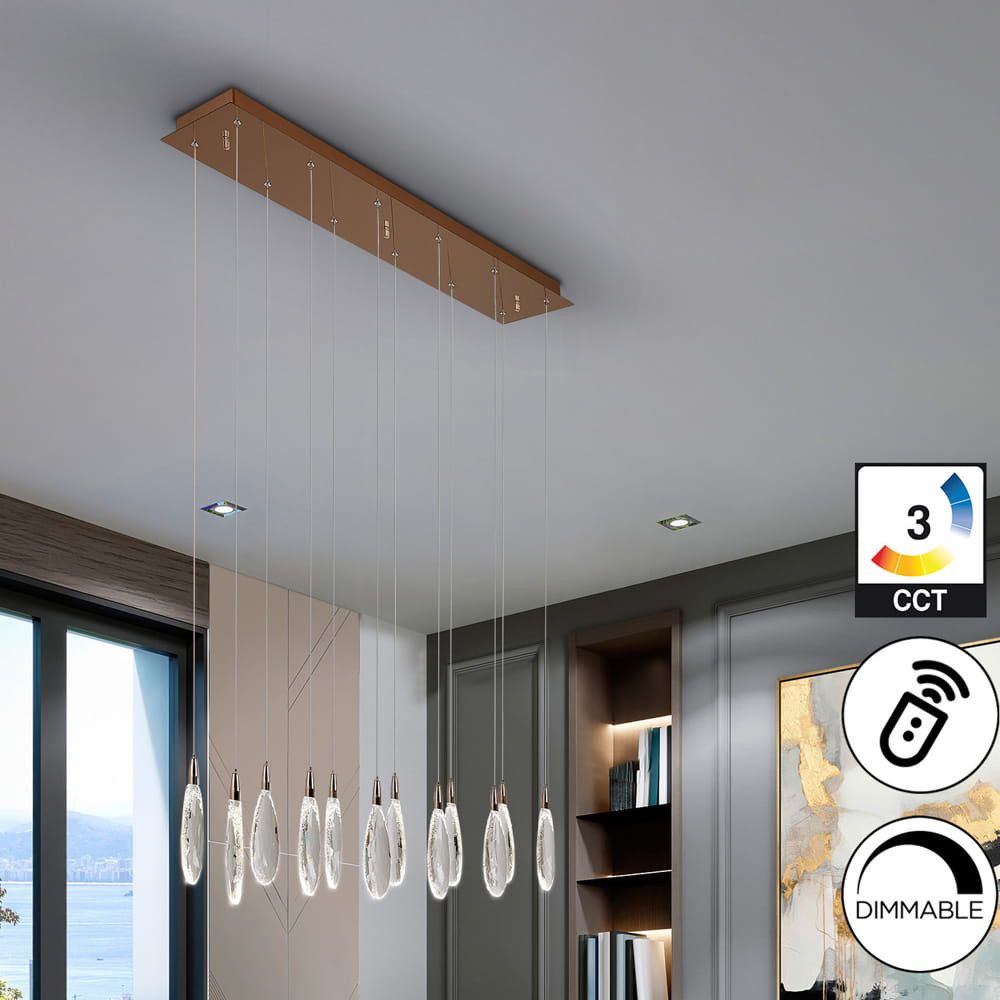 Lámpara realizada en acero y metal, acabado oro rosa. 12 luces con lágrimas de cristal tallado con bordes craquelados. Regulable en altura. Iluminación LED 24W, CCT: 2700-6000 K, 2400 lm, DIMABLE. Incluye mando a distancia.