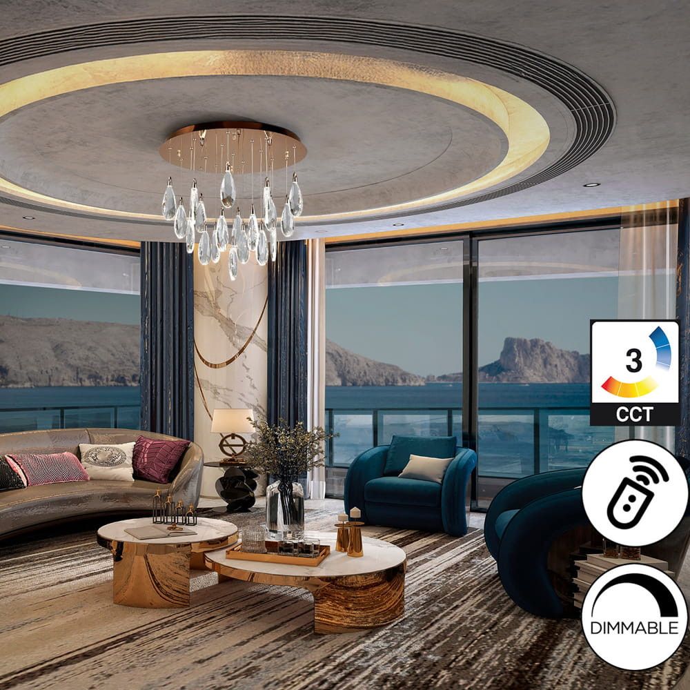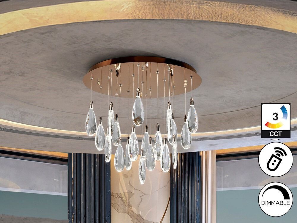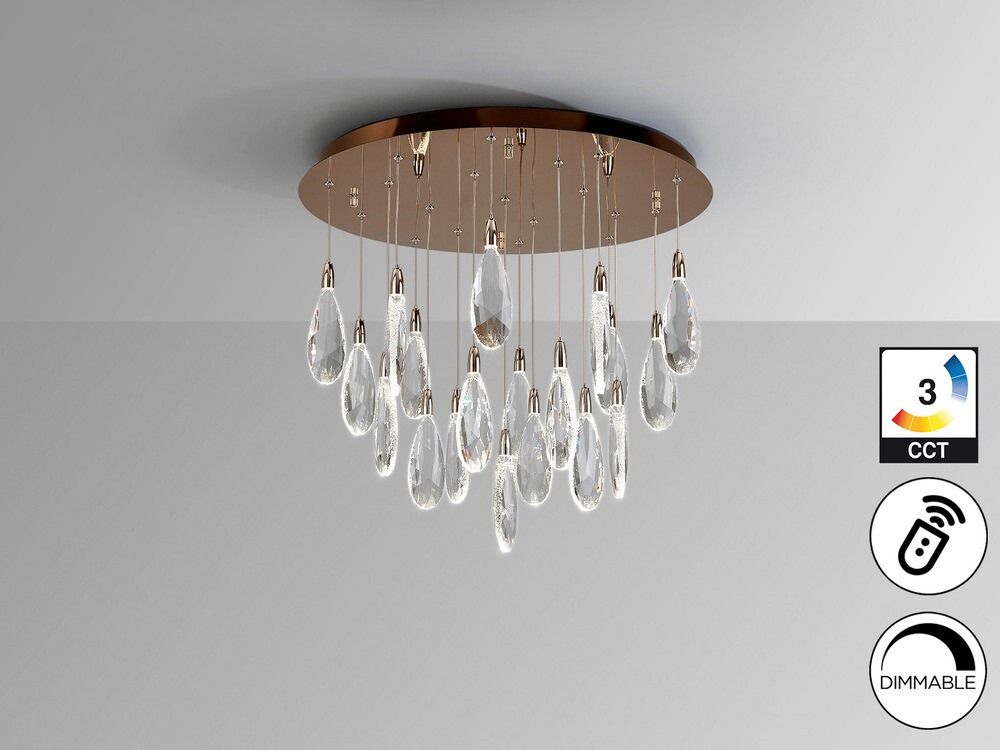 Lámpara realizada en acero y metal, acabado oro rosa. 19 luces con lágrimas de cristal tallado con bordes craquelados. Regulable en altura. Iluminación LED 38W, CCT: 2700-6000 K, 3800 lm, DIMABLE. Incluye mando a distancia.