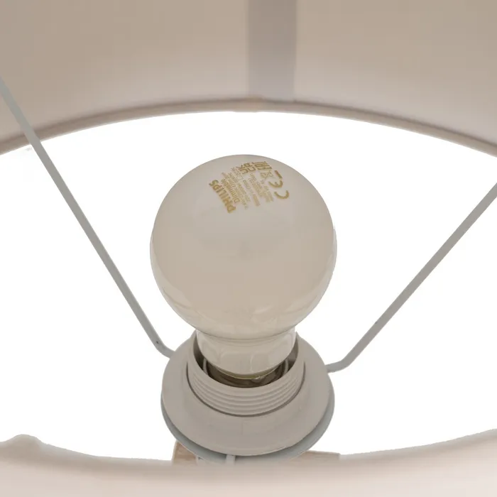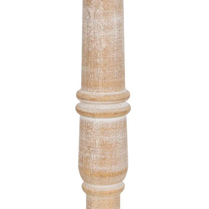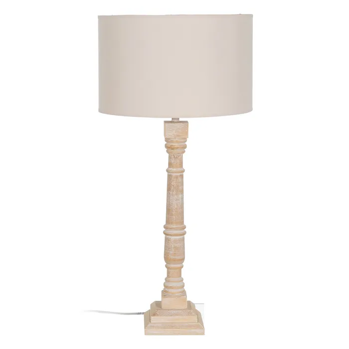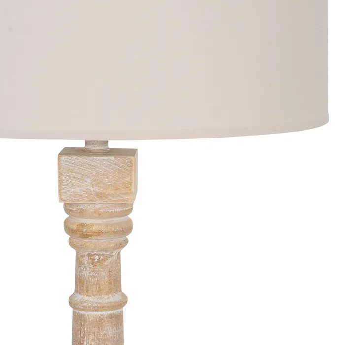 Material base: madera de roble. Medida base: 16x16x60cm. Material tulipa: Algodón, lino. Medida tulipa: 40x40x25cm. Cable blanco, medida: 140cm. Voltaje: 220-240V. Casquillo: E27. Bombilla: Máx. 40W (no incluída).
