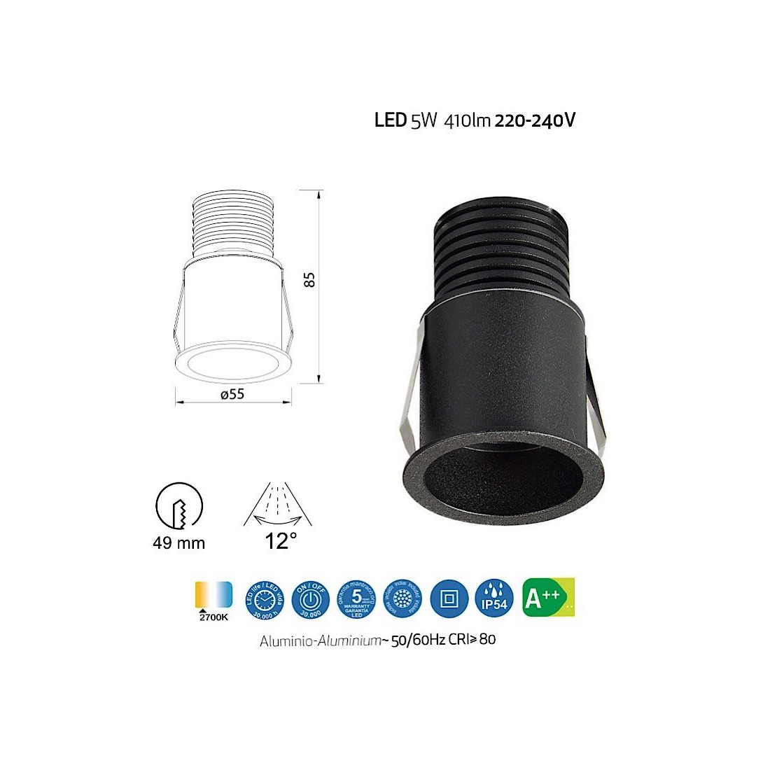 Empotrable de techo negro LED pequeño Ø55mm. 5W, 4000K, 410lm, 12º