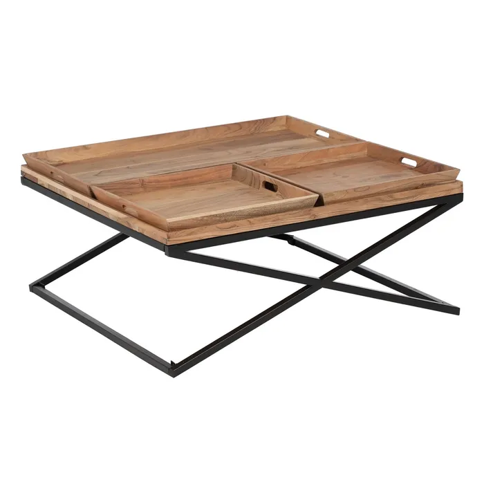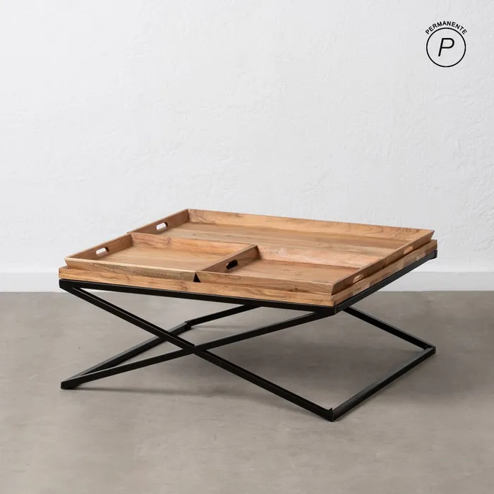 Material: Madera de mango y hierro. Altura patas: 33cm Bandeja grande: 84x42x5cm Bandeja pequeña: 42x42x5cm.