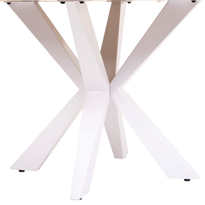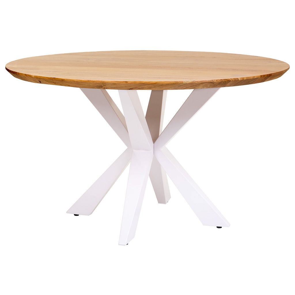 Aporta distinción y elegancia al corazón de tu hogar con esta excepcional mesa de comedor redonda de madera de acacia con pata de araña en color blanco. Con un diámetro de 130 cm y 77h cm, es perfecta para 4-6 comensales y su forma circular facilita la conversación y el intercambio. El tablero está elaborado en madera maciza de acacia con el característico borde suizo redondeado y suavizado, que aporta un acabado refinado y contemporáneo. Las vetas naturales del acacia, visibles en toda su belleza, hacen que cada mesa sea una pieza irrepetible. La espectacular pata de araña con estructura metálica de hierro en color blanco lacado brillante forma una elegante red de triángulos cruzados que contrastan visualmente con el tono natural del tablero. Medidas D130x77h cm. El contraste entre la cálida madera natural y el blanco brillante de la estructura convierte esta mesa en una auténtica obra de arte funcional para comedores modernos, minimalistas o de estilo escandinavo.
