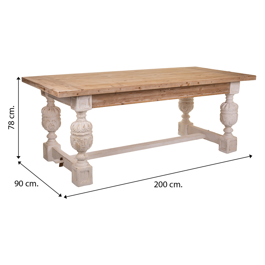 Mesa Rectangular de madera de abeto de 200x90x78 cm Esta mesa de madera de abeto en color natural y patas de color blanco envejecido, aportaran a tu salon una autentica belleza. Dispone de una estructura Rectangular y patas robustas, la mesa en estilo moderno y clasico a la vez, encaja perfectamente en ambientes nordicos, rusticos, contemporaneos e industriales. Una mesa con personalidad y caracter propio. Sus dimensiones y caracteristicas son: Largo:200 cm. Alto: 78 cm. Ancho: 90 cm. Material: madera de abeto