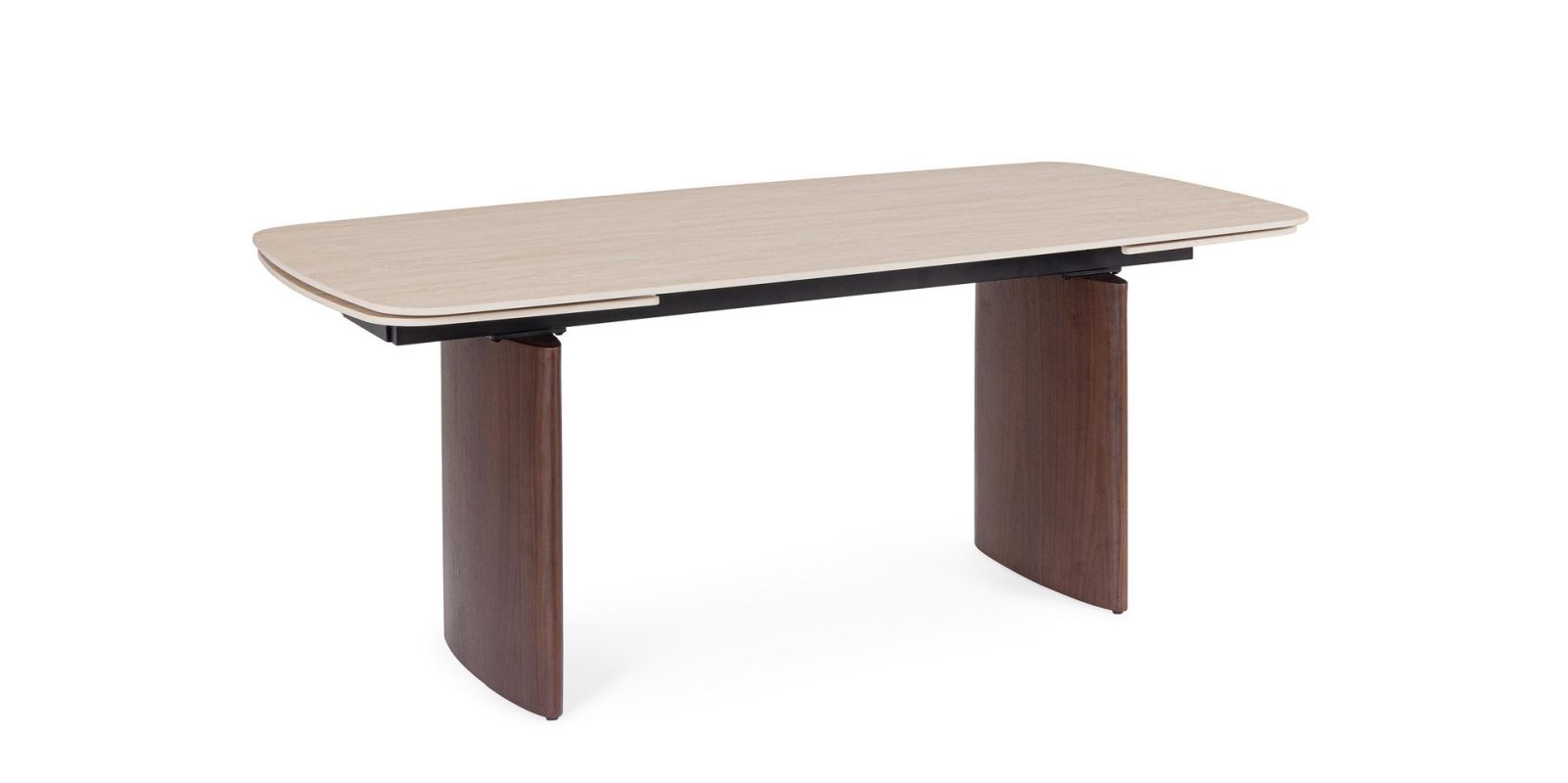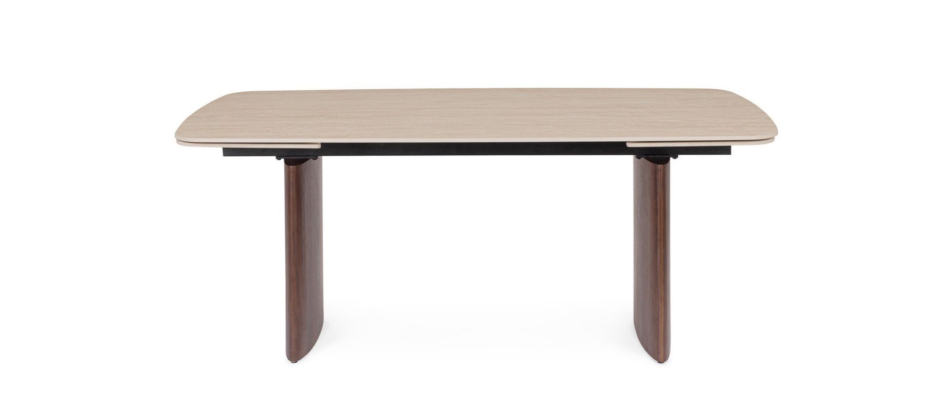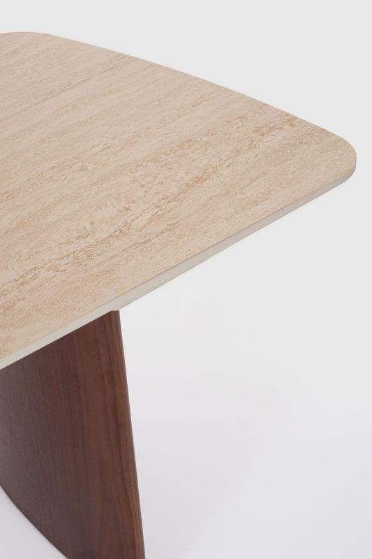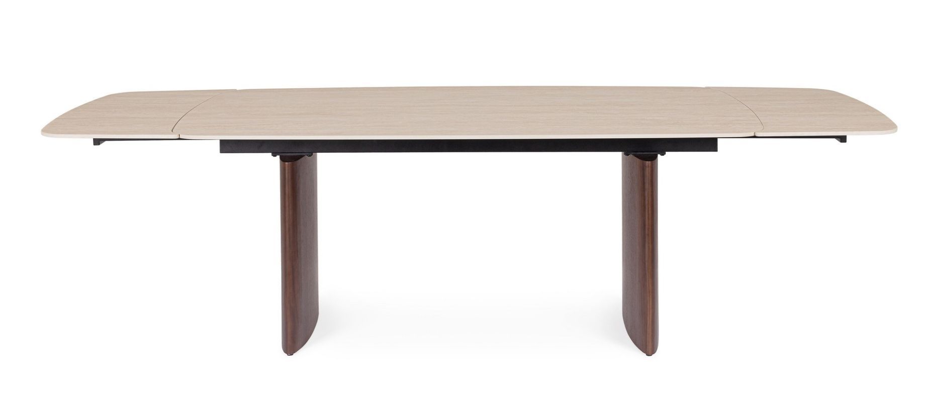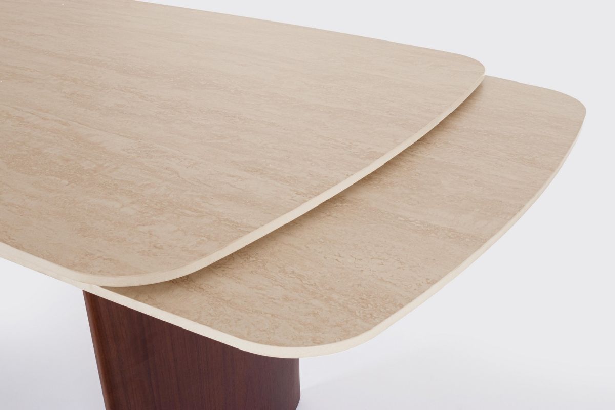 TABLERO DE GRES PORCELÁNICO EFECTO TRAVERTINO. SOPORTE TABLERO DE ACERO BARNIZADO A POLVO EPOXI. PATAS DE DM CHAPADO EN MADERA DE NOGAL. EXTENSIONES INDEPENDIENTES. PIES REGULABLES. PATAS PARA MONTAR.