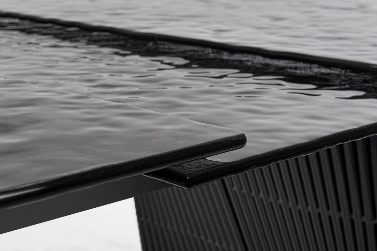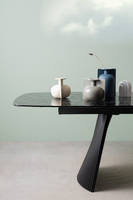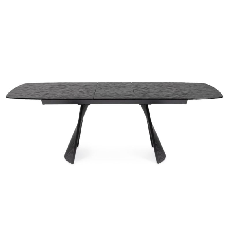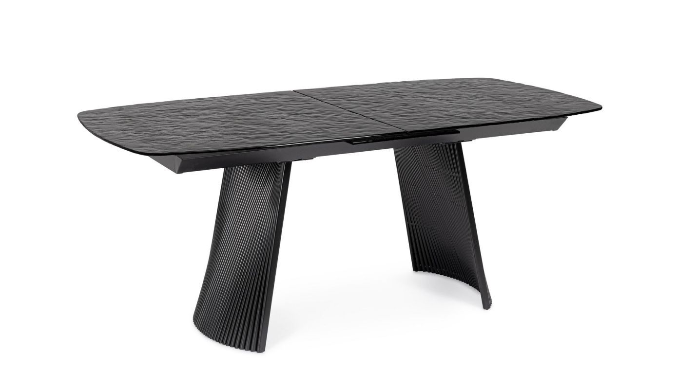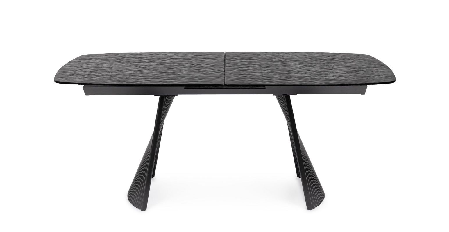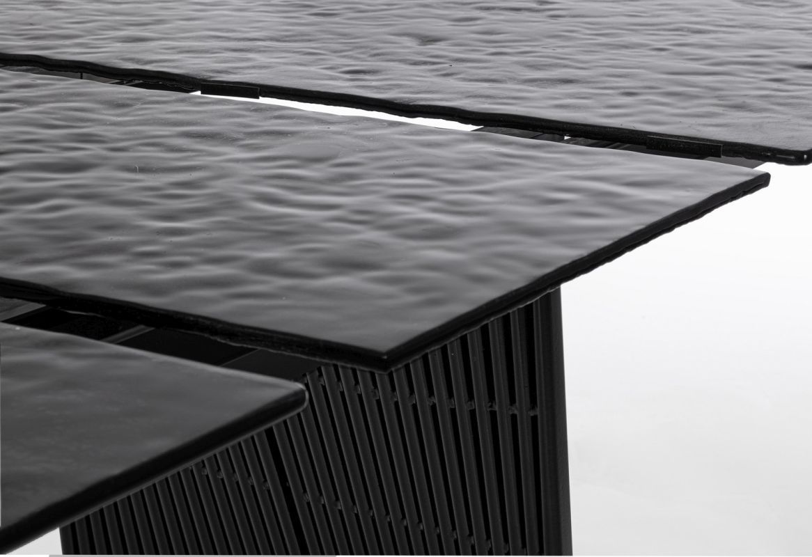 PATAS DE ACERO BARNIZADO A POLVO EPOXI. TABLERO DE VIDRIO (10MM) EXTENSIBLE CON EFECTO ABUJARDADO. PATAS PARA MONTAR.
