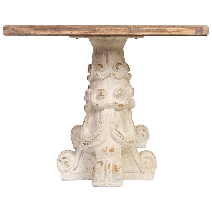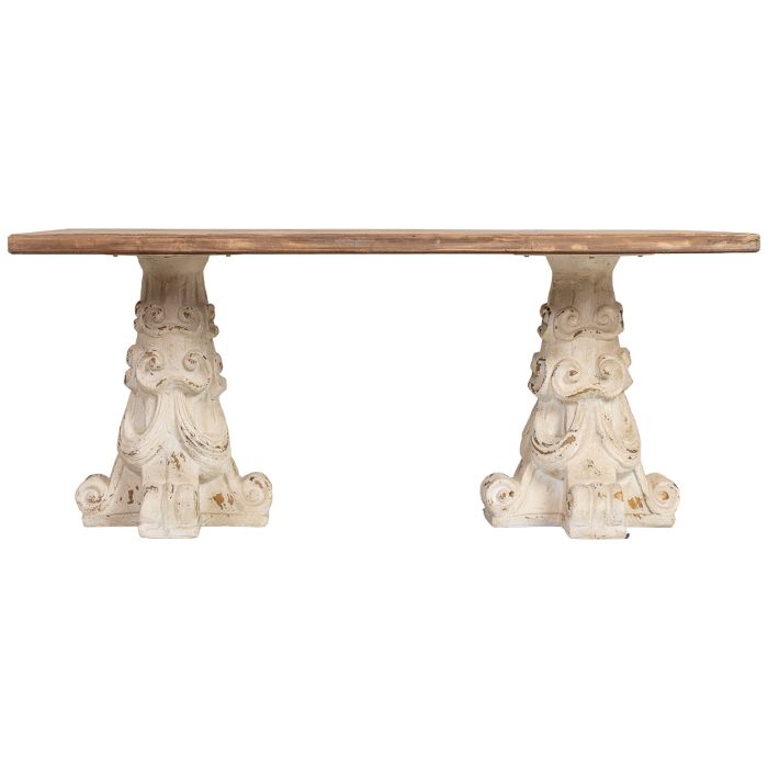 Mesa auxiliar de gran tamaño y altura inusual para una mesa de centro (180 cm de largo y 78 cm de alto). Combina una tabla de madera marrón con una base o estructura de magnesio blanco. Sus dimensiones la acercan más a una mesa de comedor o un gran escritorio que a una mesa de centro estándar. Es una pieza robusta de estilo contemporáneo o industrial, ideal para espacios amplios que requieran una superficie de apoyo destacada.