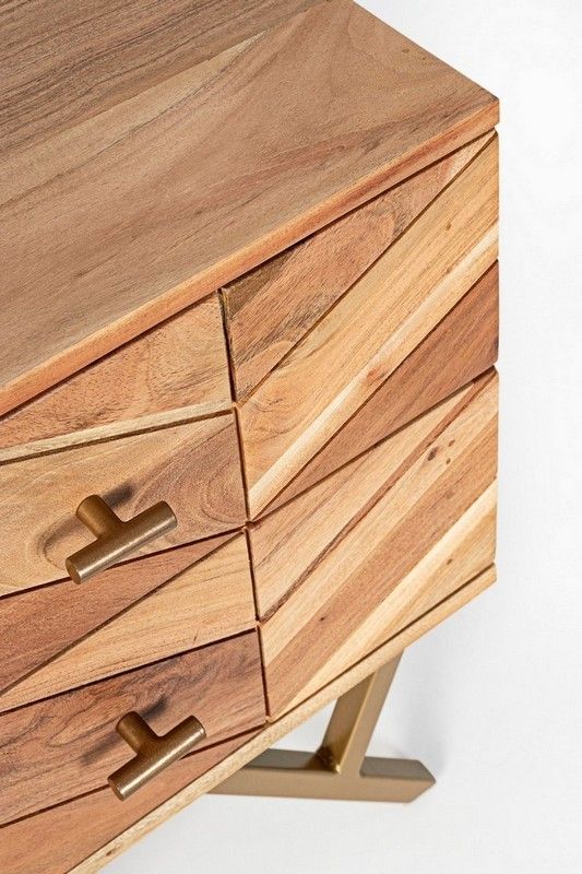 ESTRUCTURA DE MADERA DE ACACIA, PARTE TRASERA E INTERIORES DE LOS CAJONES DE CONTRACHAPADO, ACABADO A BASE DE BARNIZ DE POLIURETANO. PATAS DE ACERO BARNIZADO A POLVO EPOXY. PATAS PARA MONTAR.