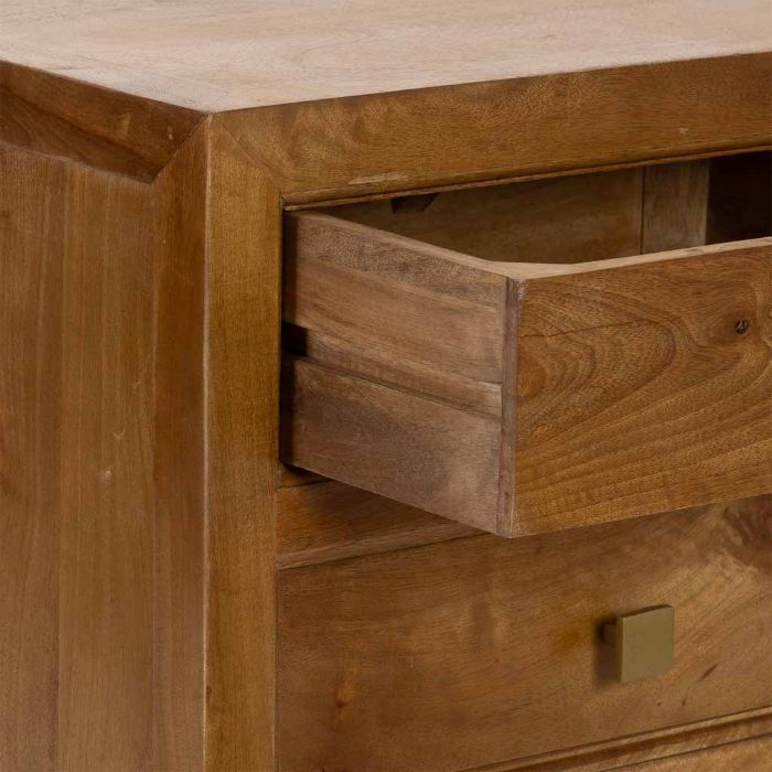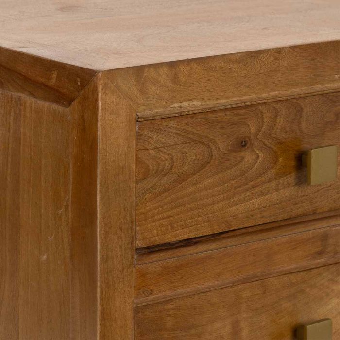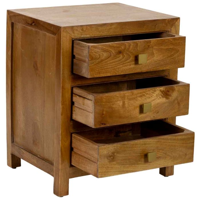 Mesita de noche de madera con acabado artesanal en tono marrón, equipada con 3 cajones que permiten mantener el orden de objetos personales y accesorios junto a la cama. Su diseño compacto y funcional, junto con un estilo cálido y clásico, la hace ideal para dormitorios acogedores y elegantes.