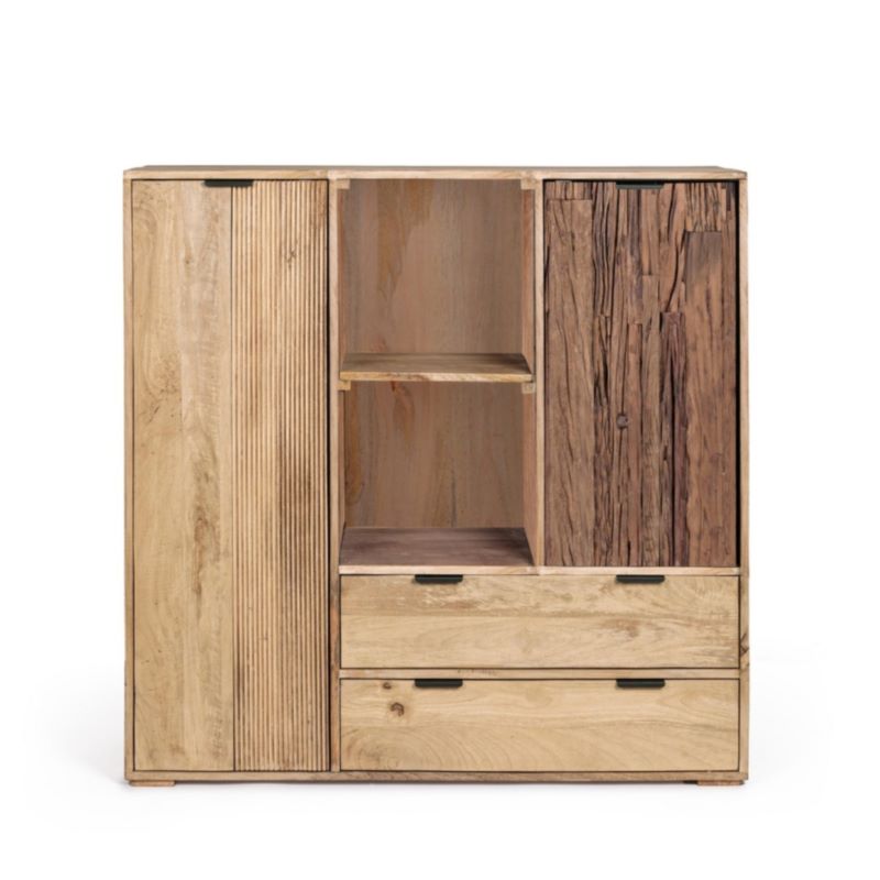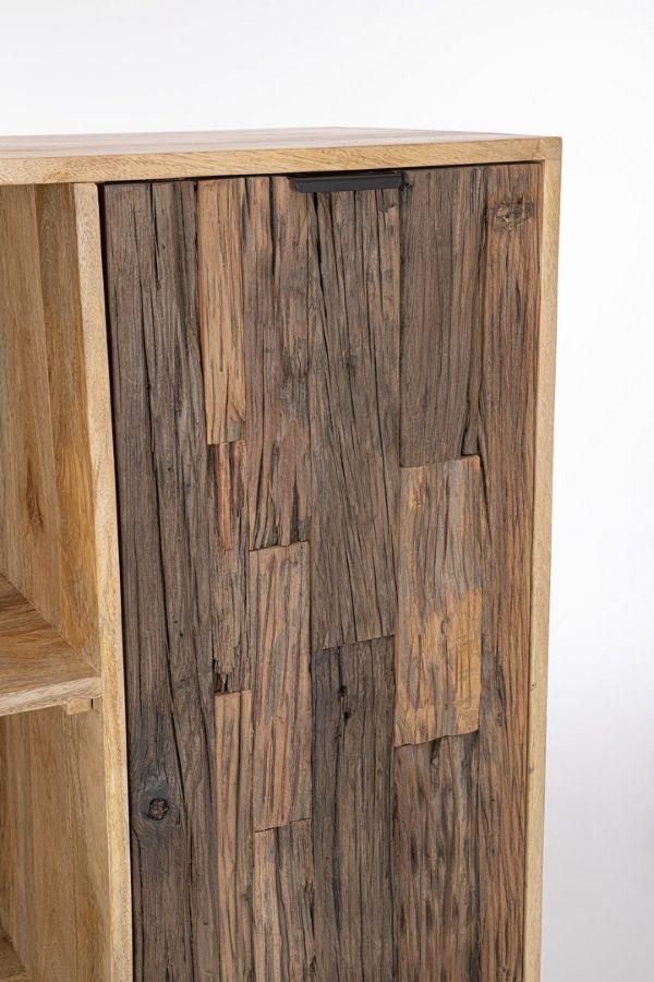 ESTRUCTURA DE MADERA DE MANGO, RESPALDO DE MADERA CONTRACHAPADA. FRENTE DE LAS PUERTAS DE MADERA DE MANGO O RECICLADO. ACABADO ACRILICO PROTECTOR. COMPARTIMIENTO PUERTA CON ESTANTE. TIRADORES DE METAL. EL PRODUCTO DE MADERA RECICLADA SE CARACTERIZA POR LA PRESENCIA DE TACOS DE MADERA DE DIFERENTES FORMAS Y COLORES. LAS GRIETAS, FISURAS O IMPERFECCIONES, QUE TAMBIÉN PUEDEN GENERARSE CON E TIEMPO, SON CARACTERÍSTICAS DE ESTE MATERIAL Y HACEN QUE CADA PIEZA SEA ÚNICA Y ORIGINAL.