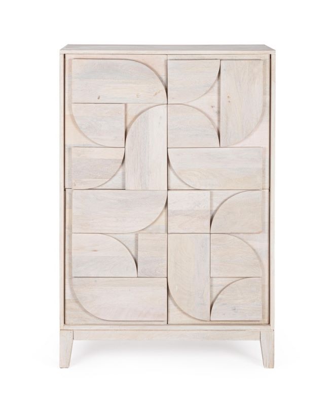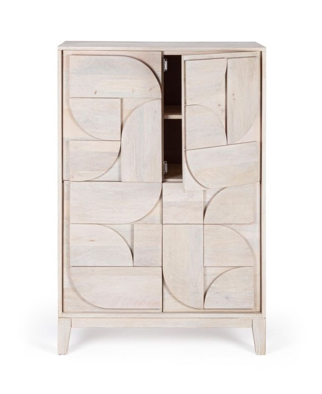 ESTRUCTURA DE MADERA DE MANGO, DORSO DE DM. ACABADO A BASE DE NITROCELULOSA DECAPADO BLANCO. EL COMPARTIMENTO DE LA PUERTA INCLUYE UN ESTANTE.