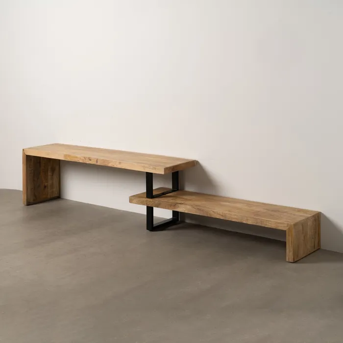 Material: madera de mango, hierro. Medidas módulo grande: 160x50cm. Medidas módulo pequeño: 140cmx36cm.