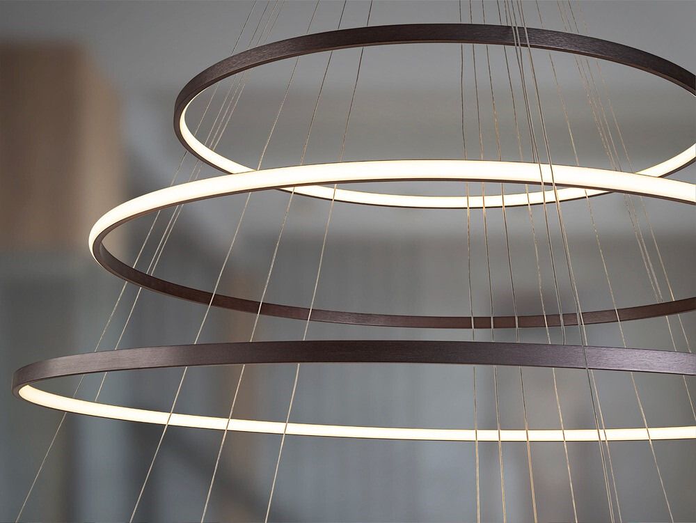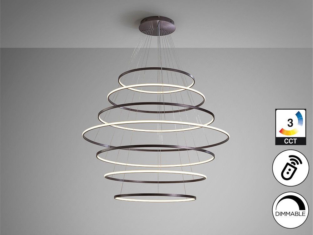 Lámpara colgante de 7 aros fabricada en aluminio con elegante acabado en bronce oscuro. Incorpora difusor de silicona para una iluminación uniforme y confortable. Equipada con LED integrado de 220W que ofrece una potente luminosidad de 11.000 lúmenes, con temperatura de color regulable (CCT) de 2700K a 5000K, adaptable a cualquier ambiente.