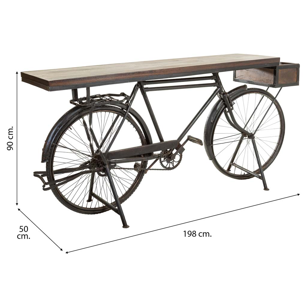 Recibidor bicicleta industrial color negro de hierro de 198x50x94 cm. La bicicleta esta fabricada en madera de mango y metal de hierro pintado en negro, lleva las ruedas de caucho. Una recreacion realista de las primeras bicicletas, ideal para los apasionados de las bicicletas y la decoracion vintage. Un accesorio decorativo original que puedes usar como consola en la entrada, o como decoracion en el salon o dormitorio, la bicicleta industrial es de fabricacion actual a tamanyo natural. Sus dimensiones: .Largo: 198 cm. .Alto: 94 cm. .Ancho: 50 cm. .Peso: 43 kg. .No requiere montaje.