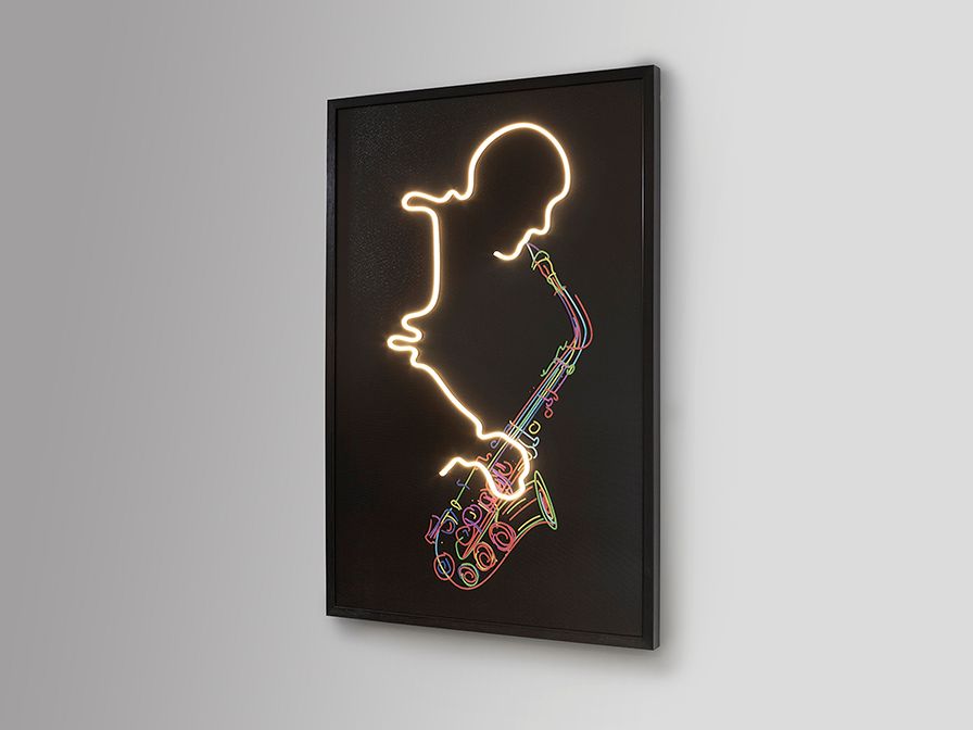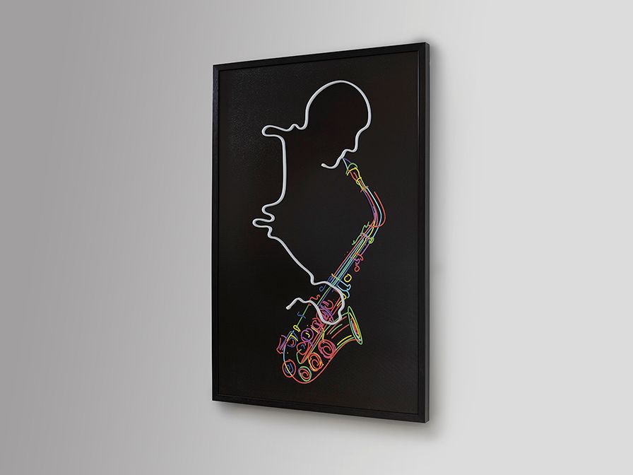 Dibujo en trazo de músico con saxofón, composición con tira de luz led decorativa. Lienzo impreso, pegado sobre tabla y enmarcado en negro.